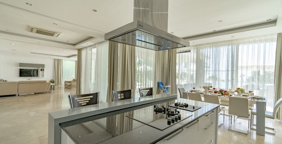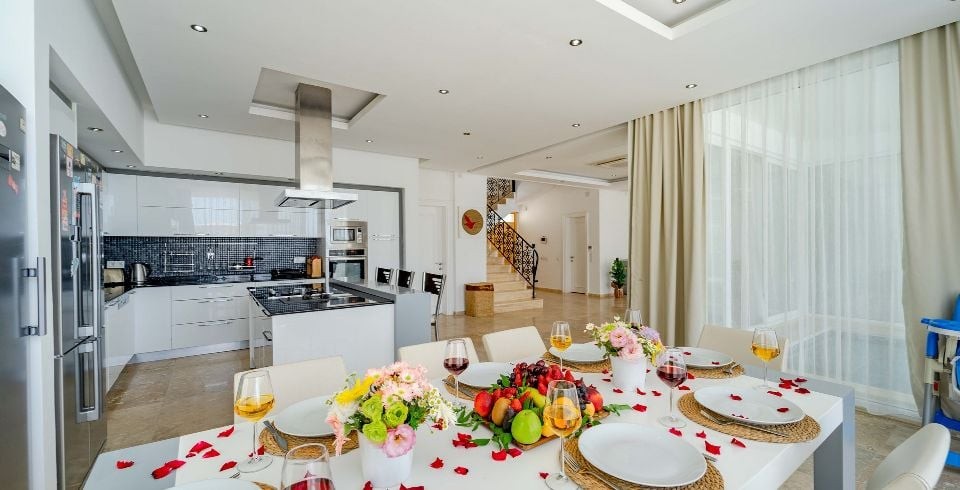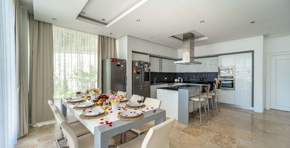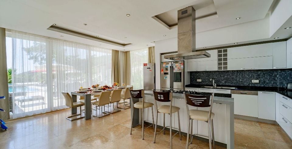 Mutfak : Modern ve geniş Amerikan mutfak, buzdolabı, çamaşır makinası, su ısıtıcısı, ekmek kızartma, 4'lü ankastre ocak, fırın, bulaşık makinası, 16 kişilik yemek takımı ve mutfak araç ve gereçleri bulunmaktadır.