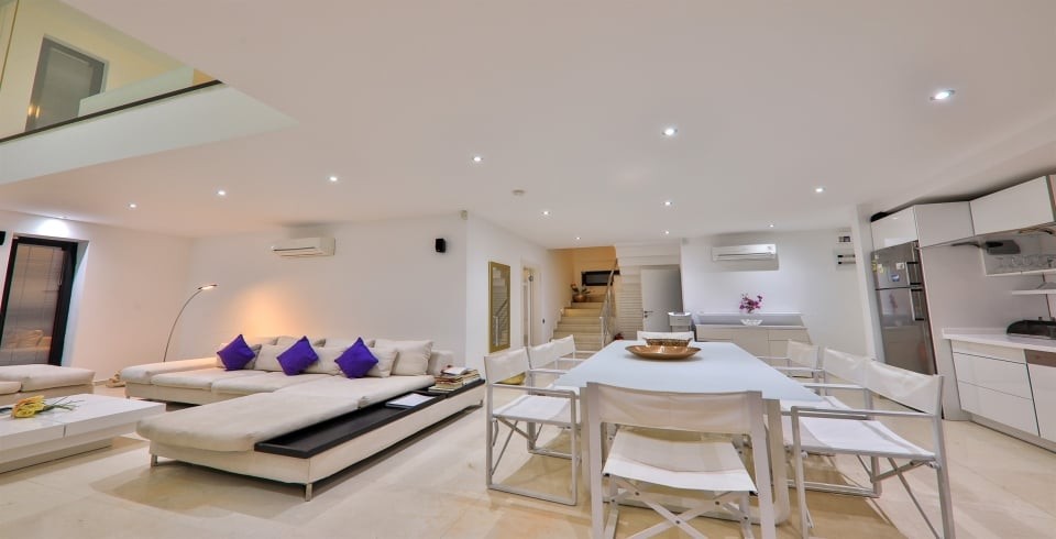Salon : Oturma grubu, orta sehpa, TV, TV ünitesi, klima, 8 kişilik yemek ve sandalyeler, WC, havuz katına çıkış bulunmaktadır.