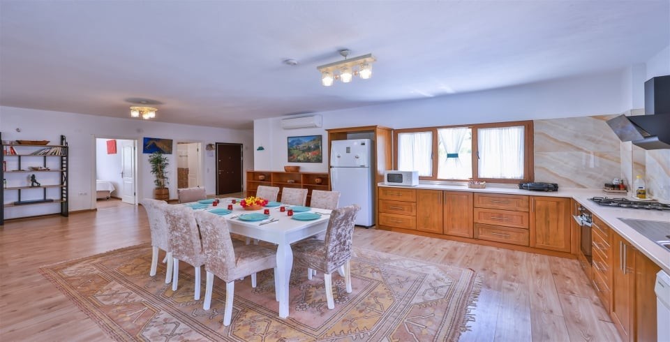 Mutfak : Modern Amerikan mutfak içerisinde 8 kişilik yemek masası, mama sandalyesi, buzdolabı, bulaşık makinası, fırın, ocak, mikrodalga fırın, tost makinası, yemek masası, yemek takımları, çatal ve bıçak takımları, tencere ve tava takımları, bardaklar bulunmaktadır.