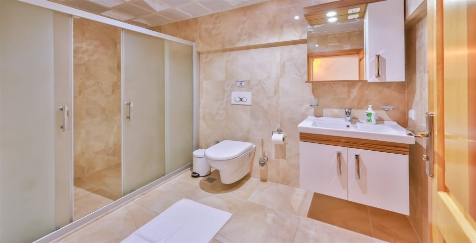 Salon : Salon içerisinde oturma grubu, TV, klima, sehpa bulunmaktadır. Havuz terasına çıkış yapılabilmektedir.
