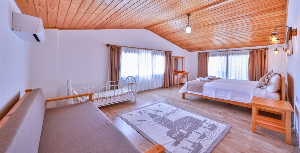 4. Yatak Odası : 1. katta 1 adet çift kişilik yatak, klima, komodin, elbise dolabı, makyaj masası, banyo ve tuvalet bulunmaktadır.