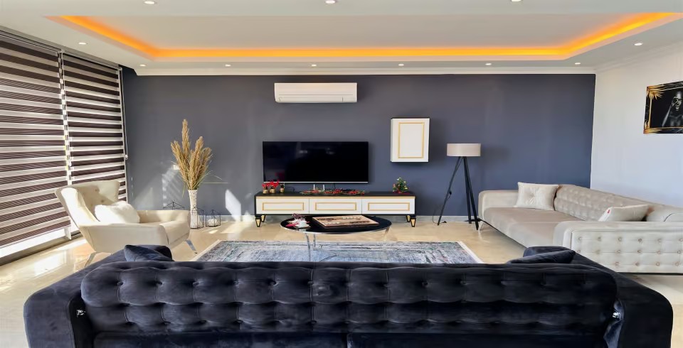Salon : Villamızın iç dizaynı da son modaya uygun olarak modern bir şekilde tasarlanmıştır. Çeşitli dekoratif eşyalarla süslediğimiz salonumuz havuzlu bahçeye açılıyor. Villa salonunda oturma grubu, TV, internet, klima, sehpa bulunmaktadır.
