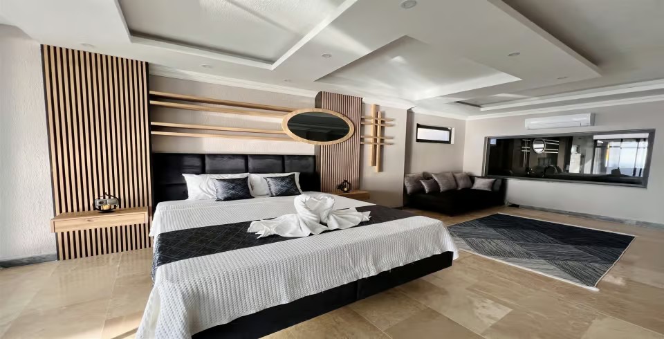 2. Yatak Odası : 1 adet çift kişilik yatak, klima, komodin, makyaj masası, elbise dolabı, banyo ve lavabo bulunmaktadır.