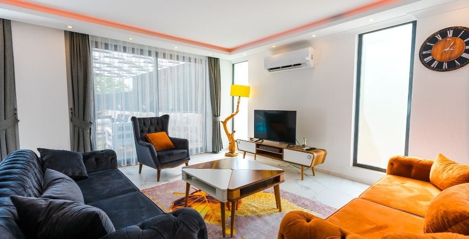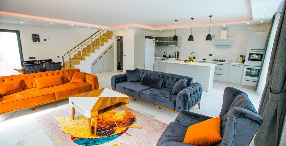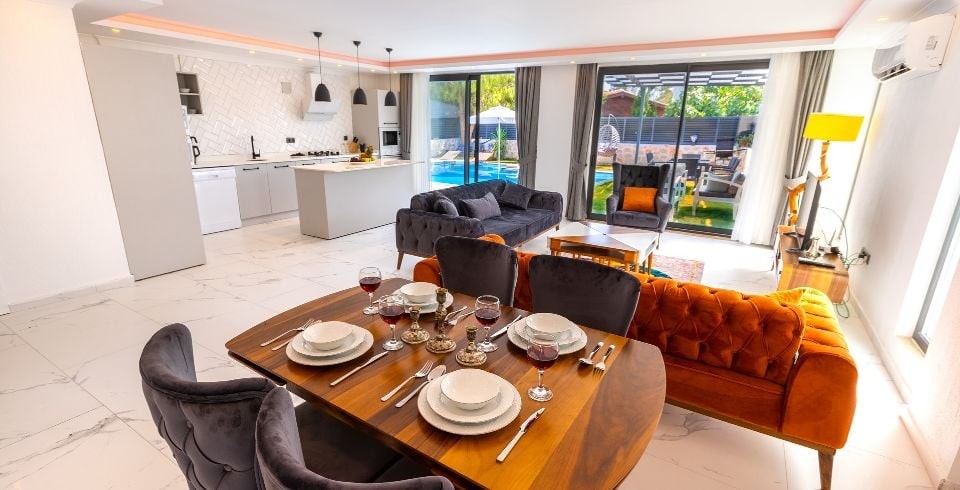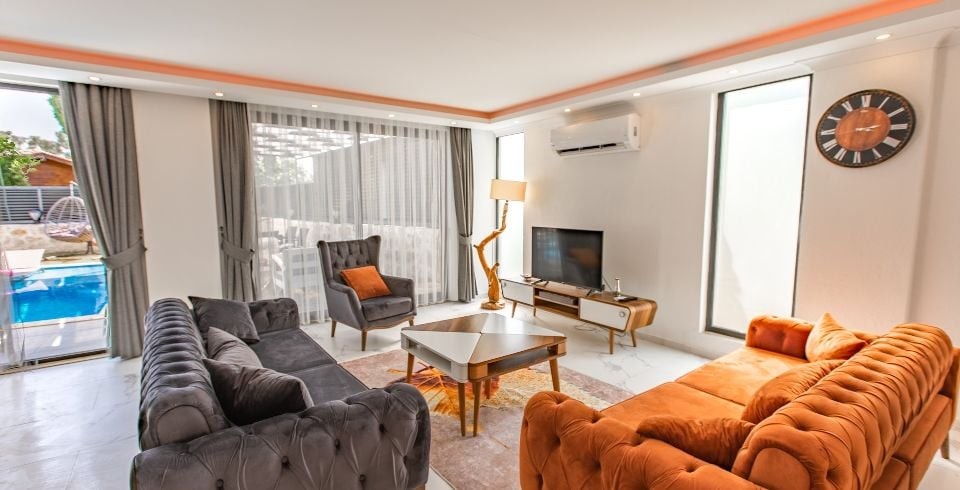 Salon : sitemize dahil olan villamızın iç dizaynı da son modaya uygun olarak modern bir şekilde tasarlanmıştır. Çeşitli dekoratif eşyalarla süslediğimiz salonumuz havuzlu bahçeye açılıyor. Villa Maba’nın salonunda oturma grubu, TV, internet, klima, yemek masası, sehpa bulunmaktadır.