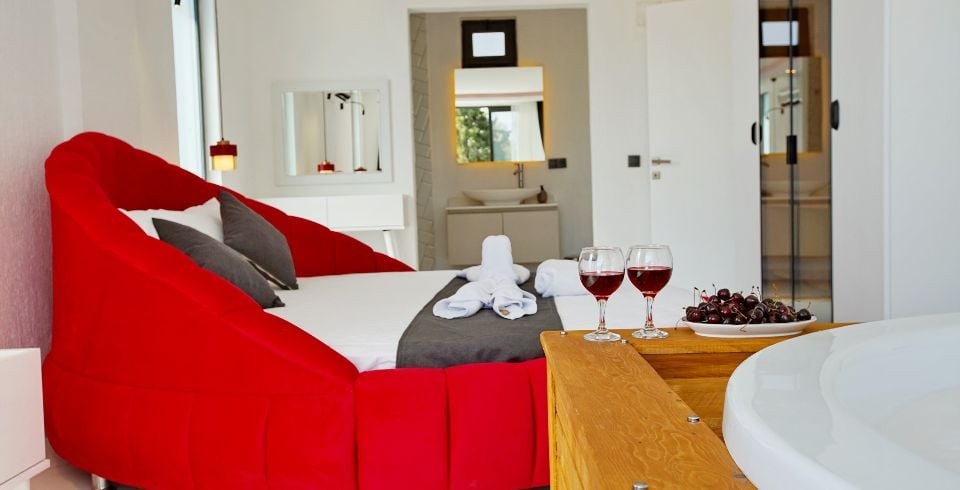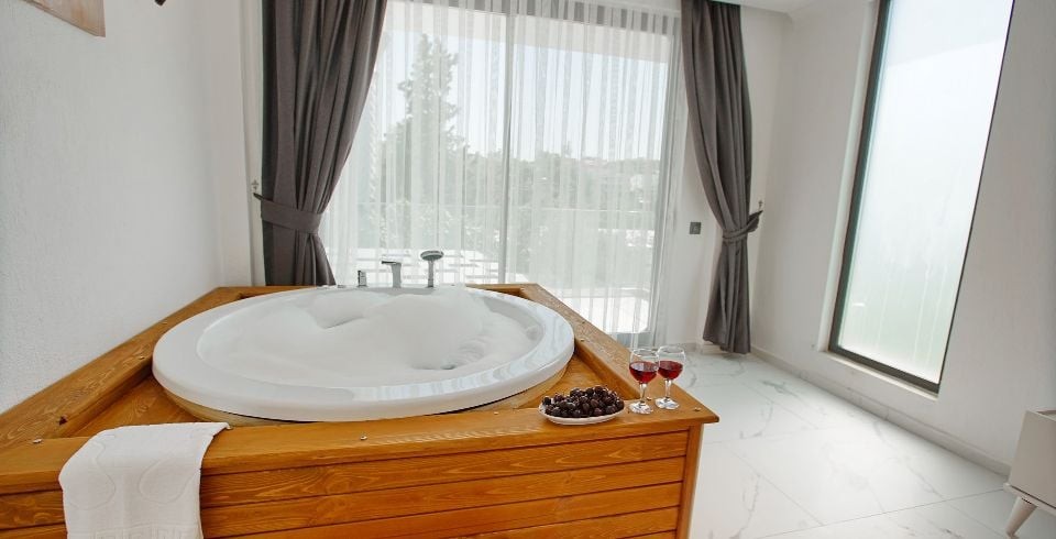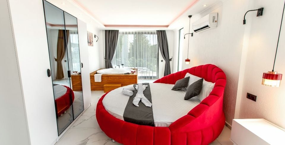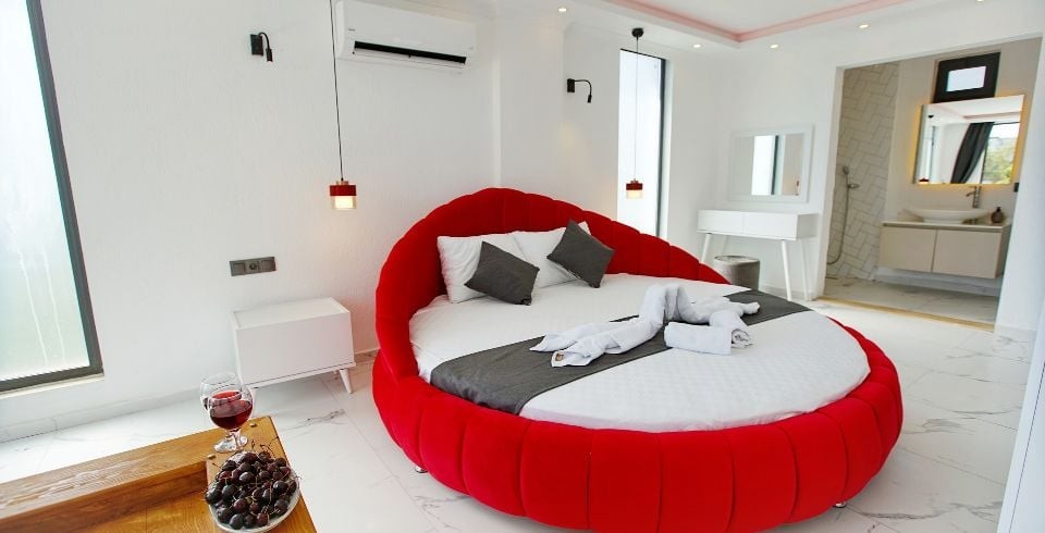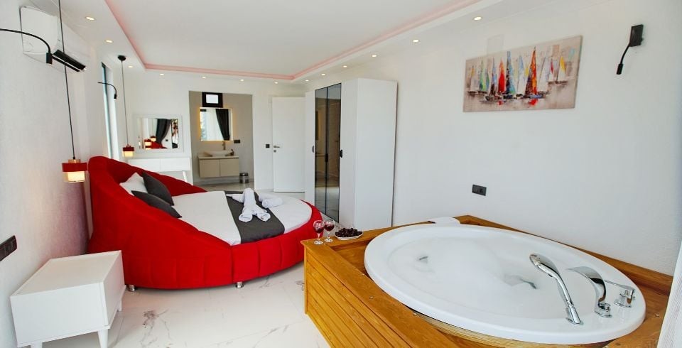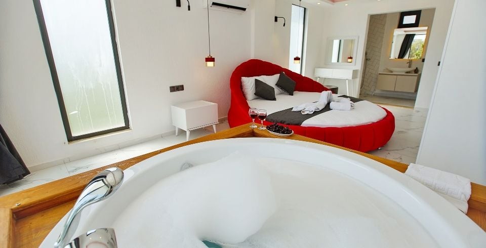 1. Yatak Odası : Doğa ile iç içe olan villamızın yatak odası manzarasında da sizi sonsuz güzel yeşillikler karşılayacak. Eşsiz doğa manzarasına karşı bir de jakuzi bulunmaktadır. Beraberinde çift kişilik yatak, klima, komodin, makyaj masası, banyo ve lavabo bulunmaktadır.