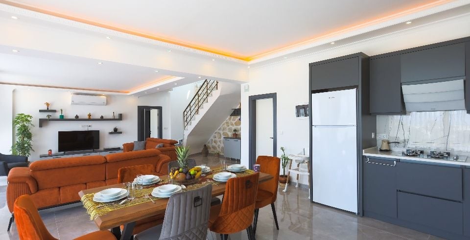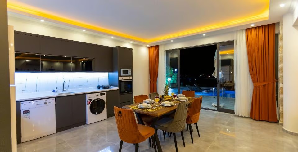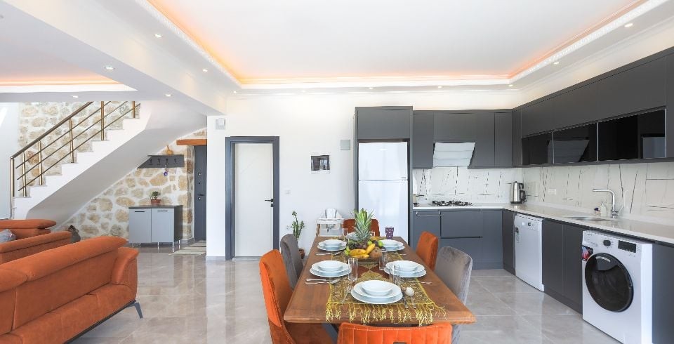 Mutfak : Amerikan açık mutfak, bulaşık makinası, buzdolabı, çamaşır makinası, su ısıtıcısı, fırın, 4'lü ocak seti, yemek masası ve mutfak araç gerekleri   mevcuttur.