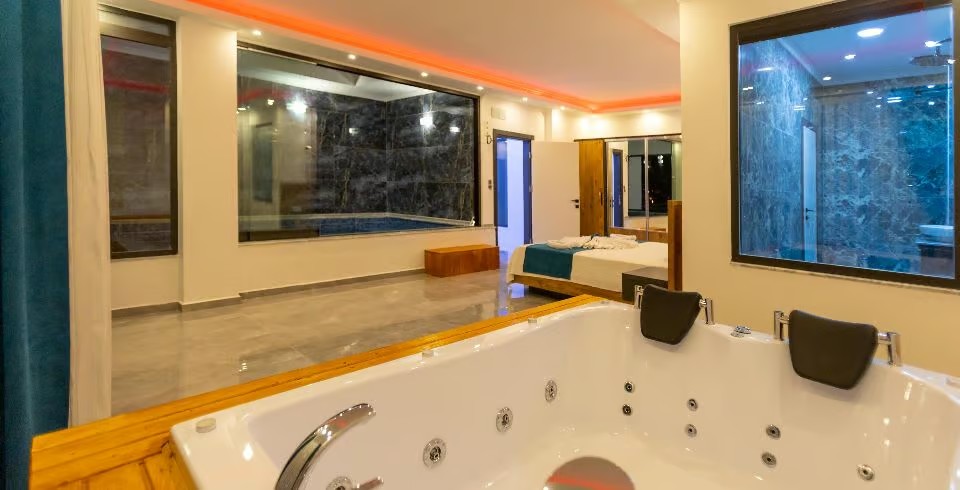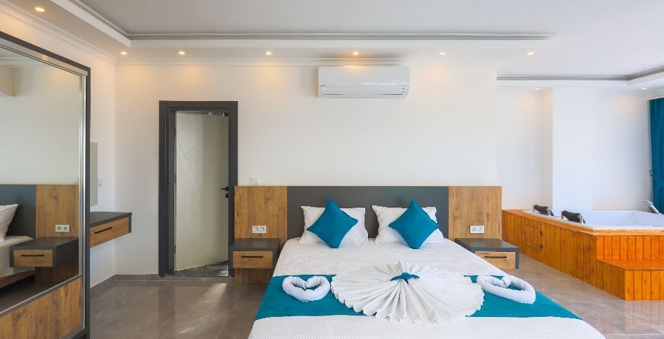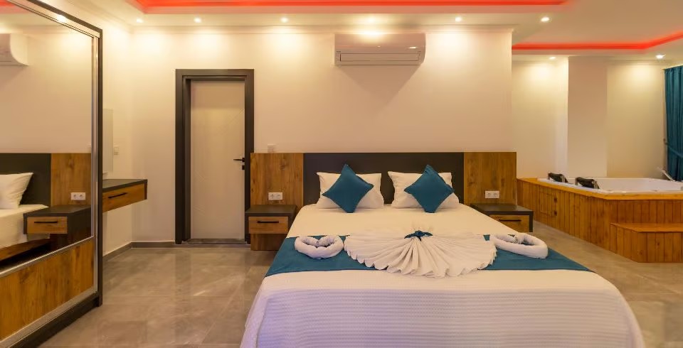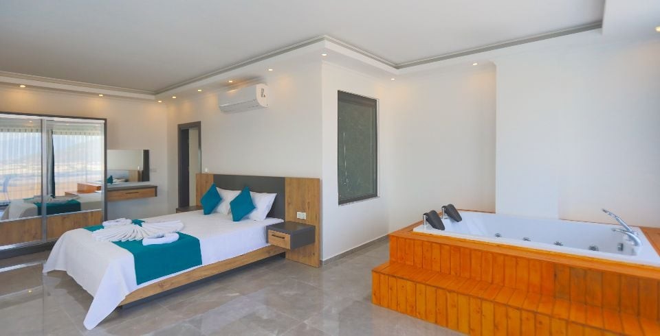 1. Yatak Odası : Çift kişilik yatak, klima, jakuzi, komodin, elbise dolabı, makyaj masası, banyo ve lavabo bulunmaktadır.