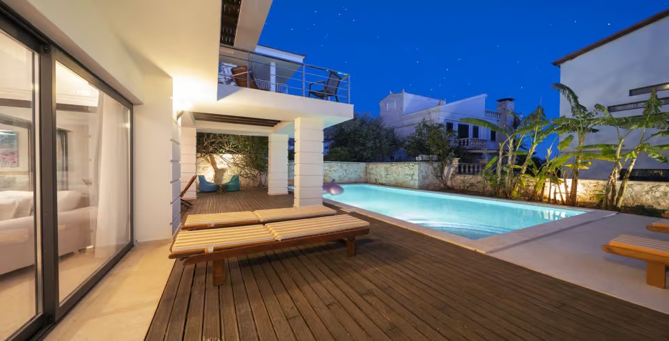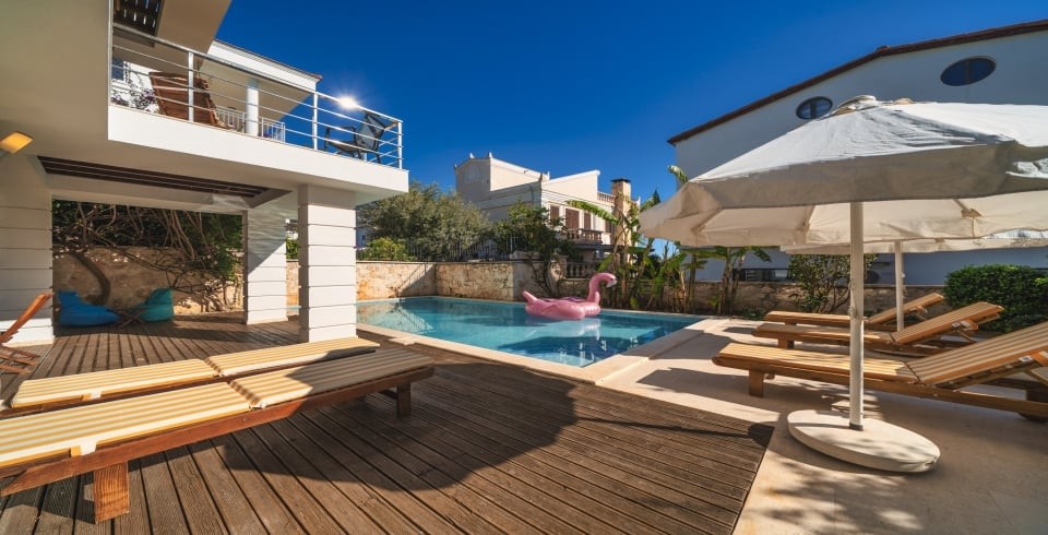 Kalkan Kalamar bölgesinde yer alan villa Simena Kalkan 4 yatak odalı 8 kişilik kapasiteye sahip olup kalabalık aile ve arkadaş grupları için tasarlanmış yazlık villadır. Villamızın suit yatak odasında, eğlenceli vakitler geçirmeniz için çift kişilik jakuzi bulunmaktadır. Villamız kalkan merkeze yürüme mesafesinde yakın bir konuma sahiptir. İstediğiniz yere kolaylıkla ulaşabilirsiniz.