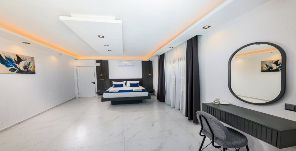 1. Yatak Odası : 1 adet çift kişilik yatak, klima, komodin, elbise dolabı, makyaj masası, jakuzi, balkon, banyo ve tuvalet bulunmaktadır.