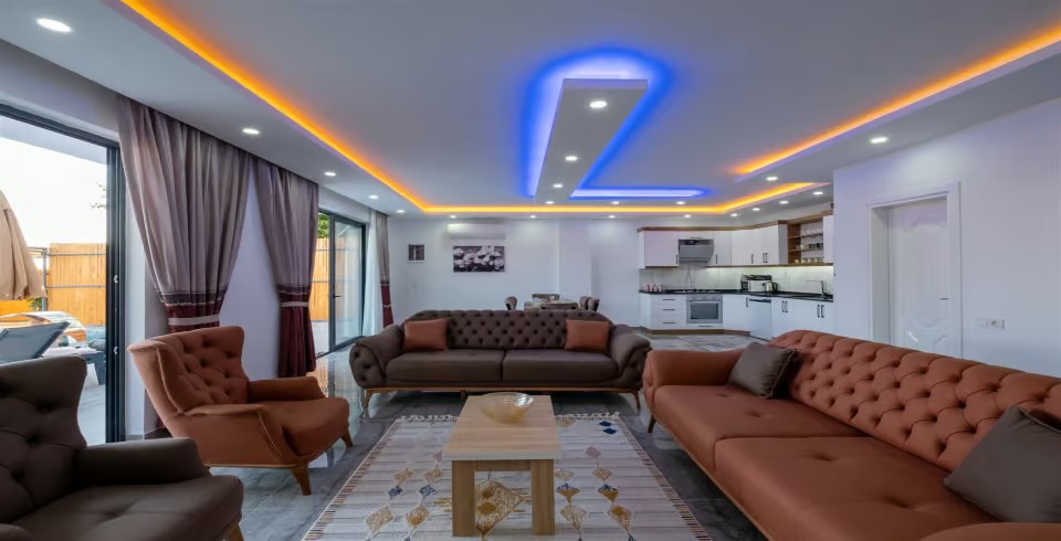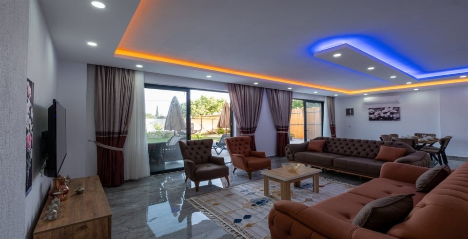 Salon: Salonumuzda oturma grubu, klima, televizyon, sehpa, uydu alıcı, internet bulunmaktadır. Havuz terasına çıkış yapılabilmektedir.