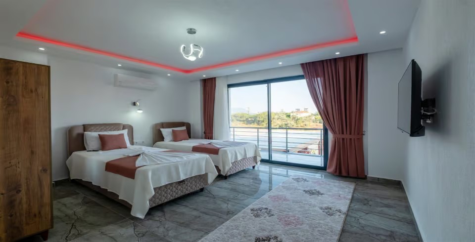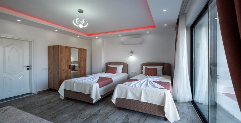 2. Yatak Odası: 2 adet tek kişilik yatak, klima, komodin, makyaj masası, elbise dolabı, banyo ve tuvalet bulunmaktadır.