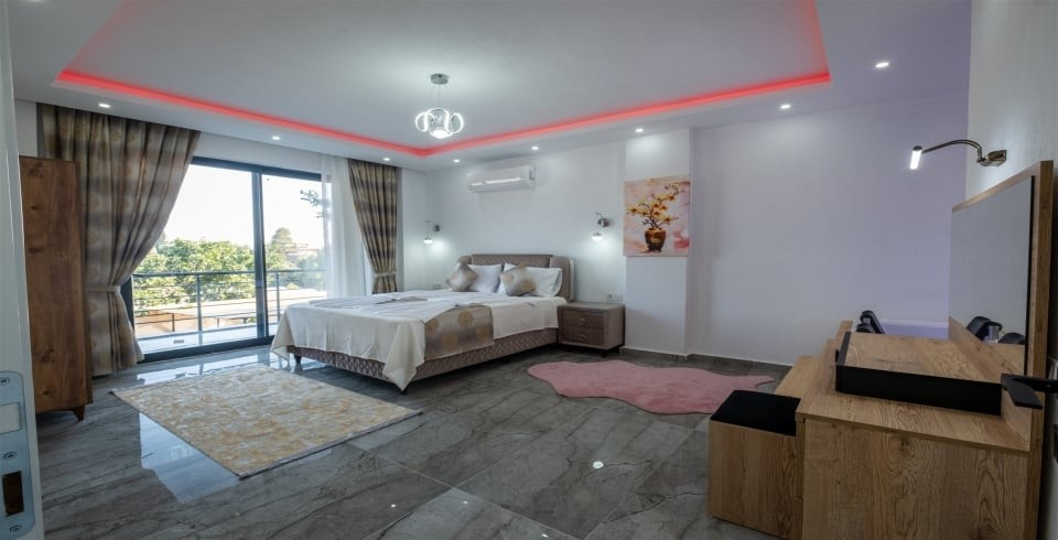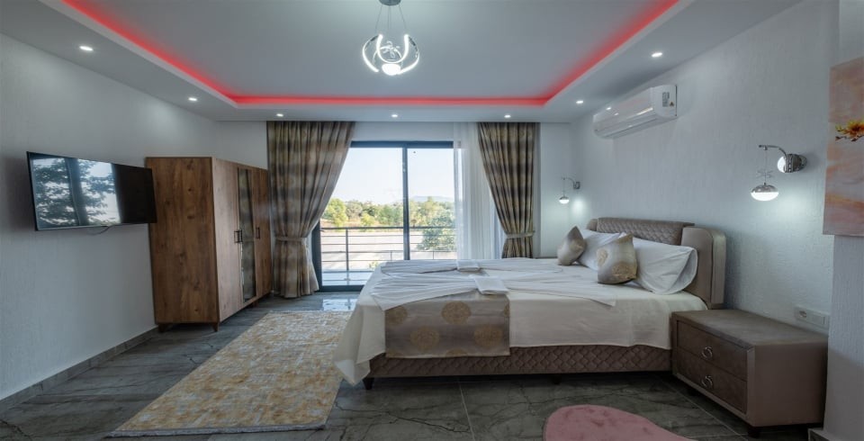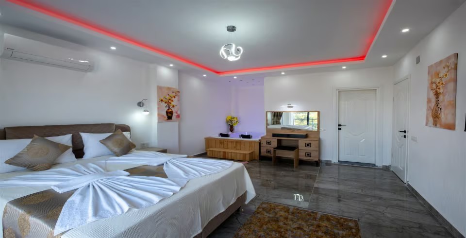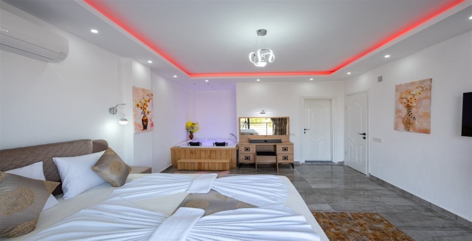 1. Yatak Odası: 1 adet çift kişilik yatak, klima, komodin, makyaj masası, elbise dolabı, jakuzi, banyo ve tuvalet bulunmaktadır.