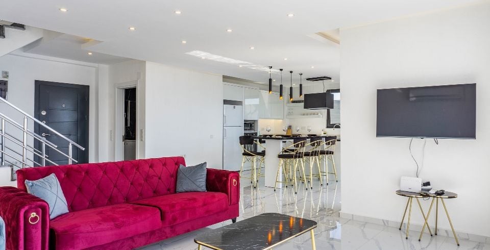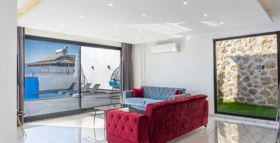 Salon: Villa salonunda konforlu oturma grubu, klima, TV, internet, uydu alıcı, yemek masası, sehpa bulunmaktadır.