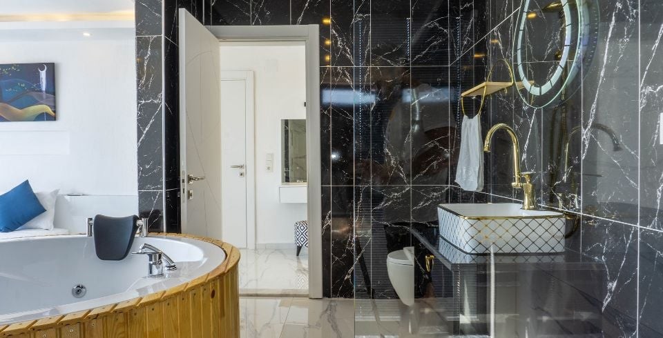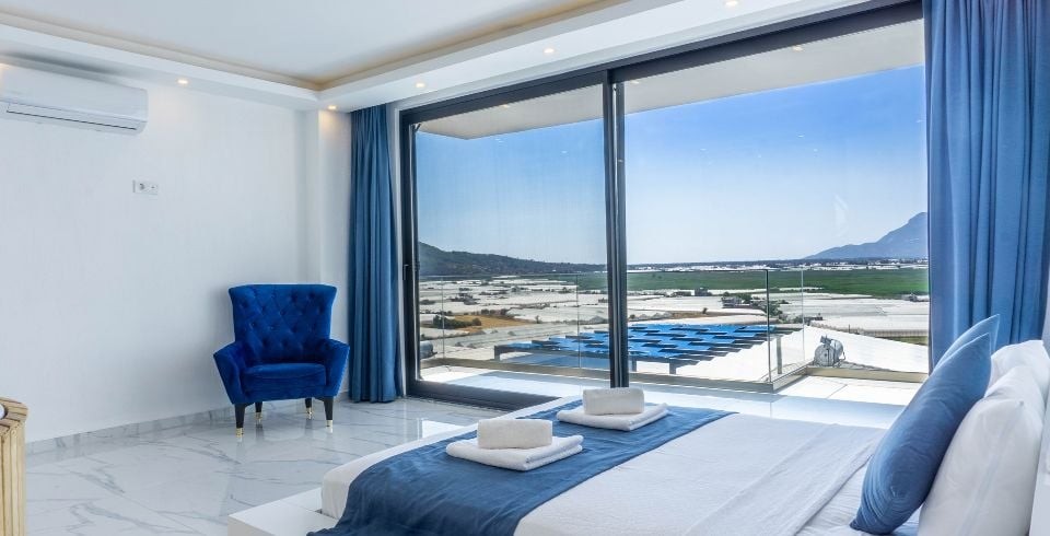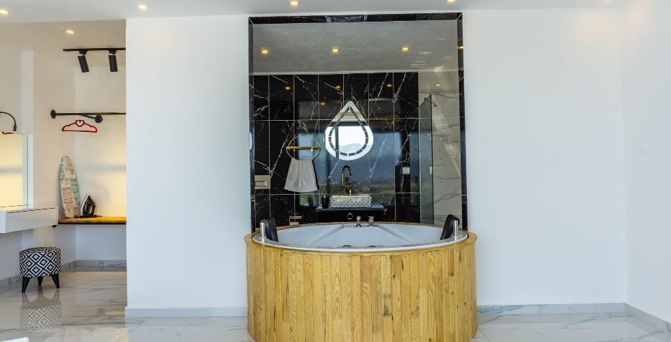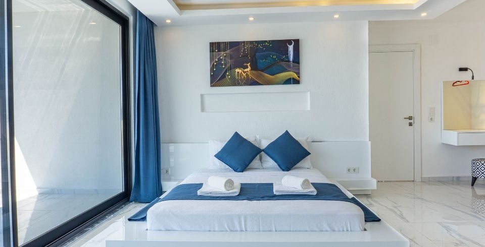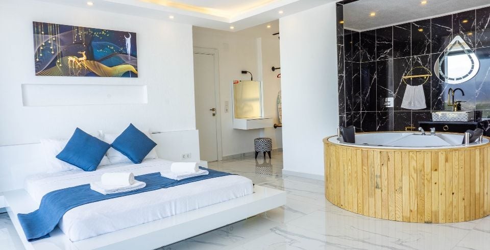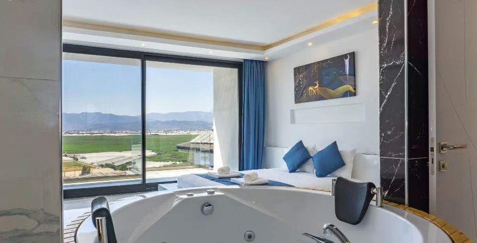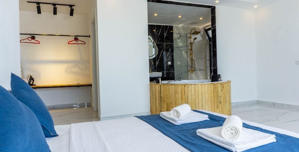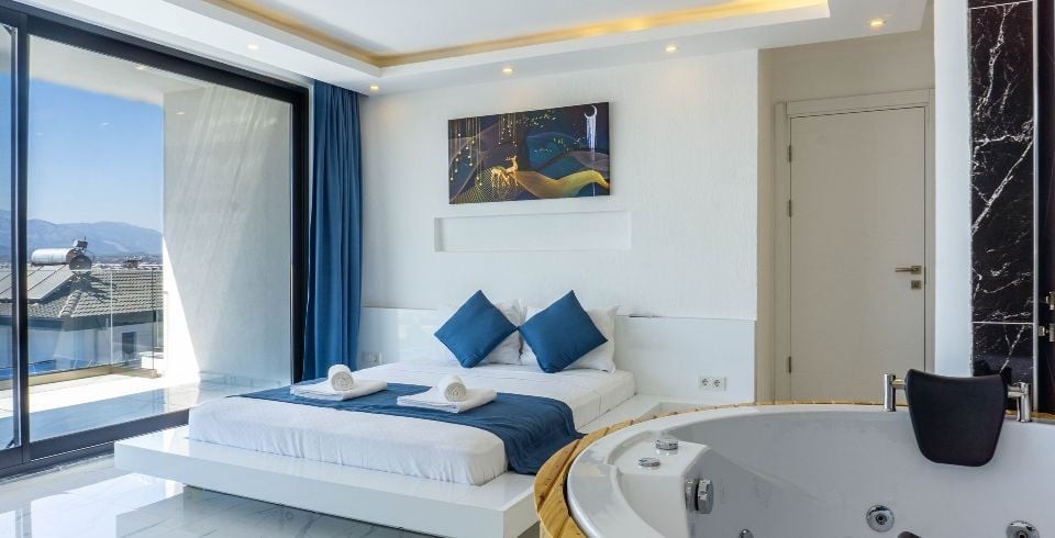 1. Yatak Odası: Çift kişilik yatak, klima, jakuzi, komodin, elbise dolabı, makyaj masası, banyo ve tuvalet bulunmaktadır.