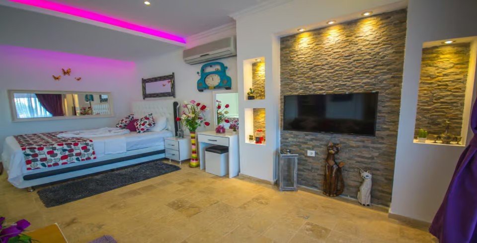 Yatak Odası: Çift kişilik yatak, komodin ,klima, makyaj masası, elbise dolabı, jakuzi, banyo ve tuvalet bulunmaktadır.