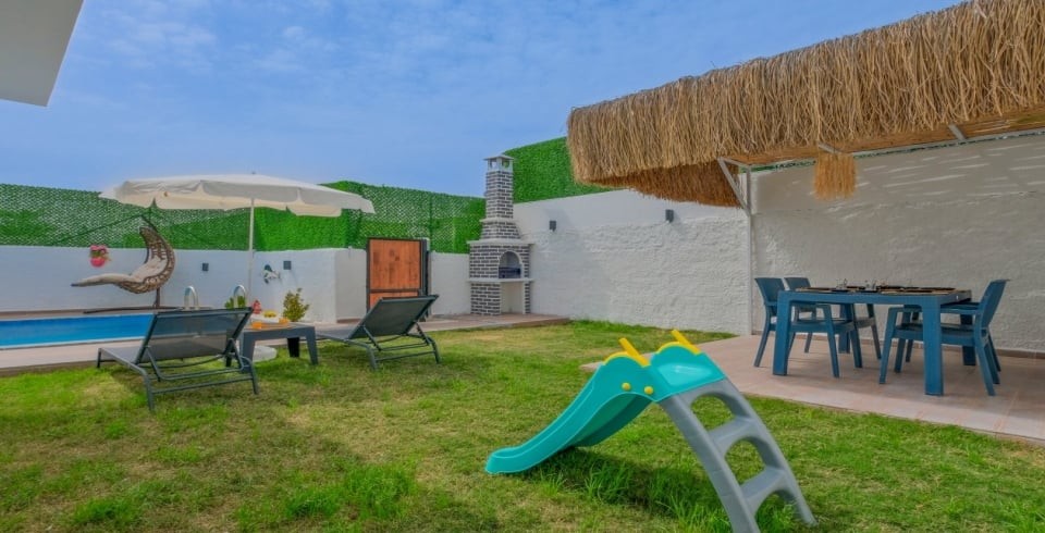 Villanın özel korunaklı yüzme havuzu, mahremiyet arayan misafirler için mükemmel bir alan sunarken, ferah bahçesi, sevdiklerinizle keyifli vakit geçirmeniz için size huzurlu bir ortam sağlar. Ayrıca, jakuzisiyle tatilinize ekstra bir lüks dokunuş katabilirsiniz. Güneşin altında serinleyip, akşamları jakuzide rahatlayarak yorgunluğunuzu geride bırakabilirsiniz.