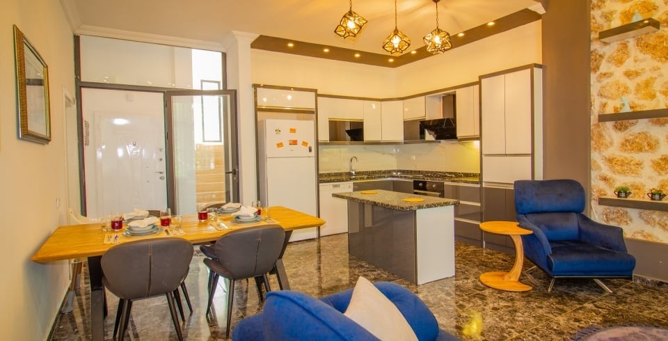 Mutfak : Modern Amerika mutfağımızda 4 kişilik yemek masası, buzdolabı, çamaşır makinesi, 4’lü ocak, tost makinesi, elektrikli su ısıtıcısı, çatal-bıçak takımı, tencere-tava takımı, bulaşık makinesi bulunmaktadır.