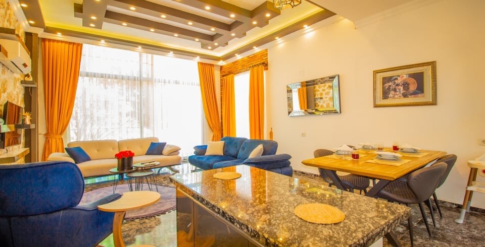 Salon : Villamızın iç dizaynı da son modaya uygun olarak modern bir şekilde tasarlanmıştır. Çeşitli dekoratif eşyalarla süslediğimiz salonumuz havuzlu bahçeye açılıyor. Villa’nın salonunda oturma grubu, tv, internet, klima, yemek masası, sehpa bulunmaktadır.