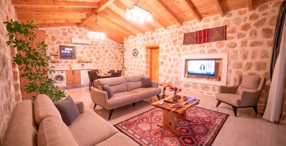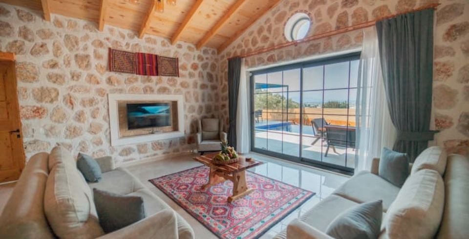 Salon : Villa Stone House'un salonunda sizi şık bir oturma grubu ile klima, televizyon, internet, uydu, koltuk, sehpa ile ferah bir salon bekliyor olacaktır. Havuz terasına çıkış yapılmaktadır.