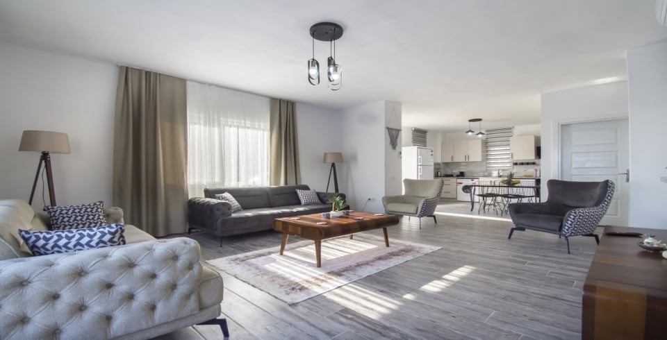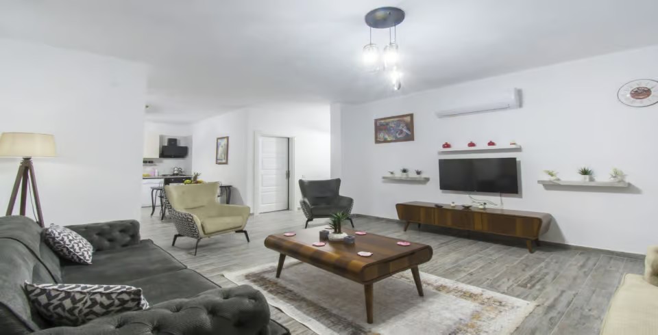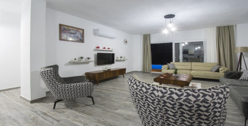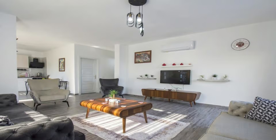 Salon : Kiralık villamızın salonunda oturma grubu, TV, uydu, internet, DVD, sehpa bulunmaktadır.