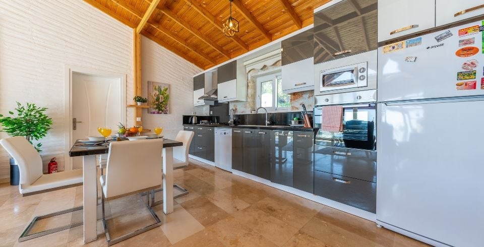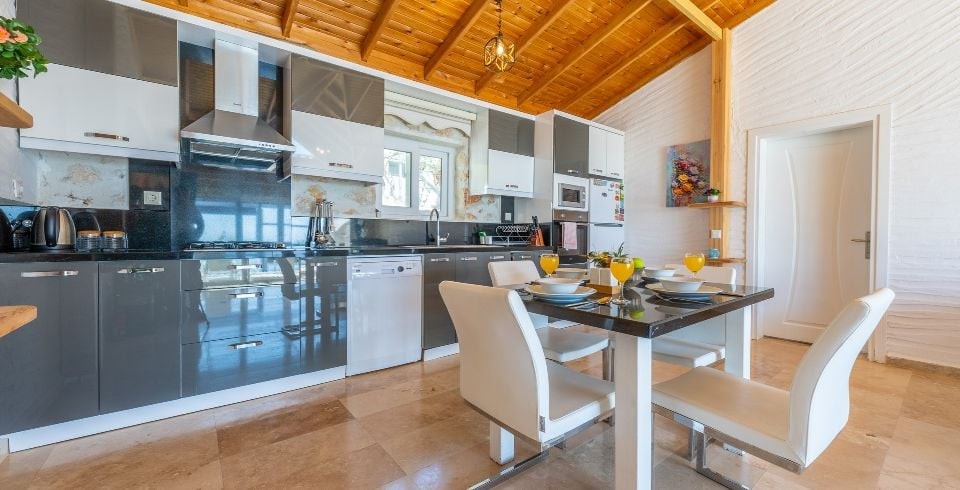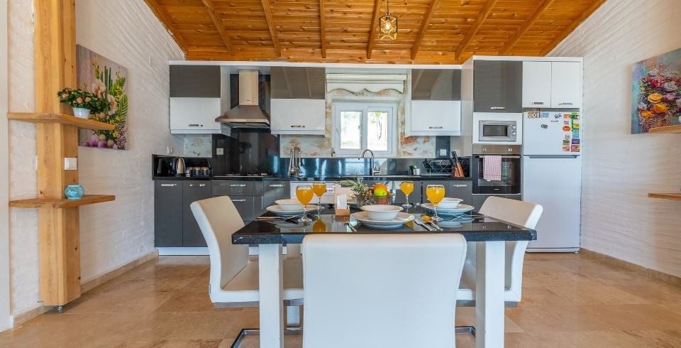 Mutfak : Modern Amerikan mutfakta buzdolabı, bulaşık makinası, fırın, 4'lü ocak, mikrodalga fırın, kettle, ekmek kızartma makinası, 4 kişilik yemek masası, yemek takımları, çatal ve bıçak takımları, tencere ve tava takımları, bardaklar bulunmaktadır.