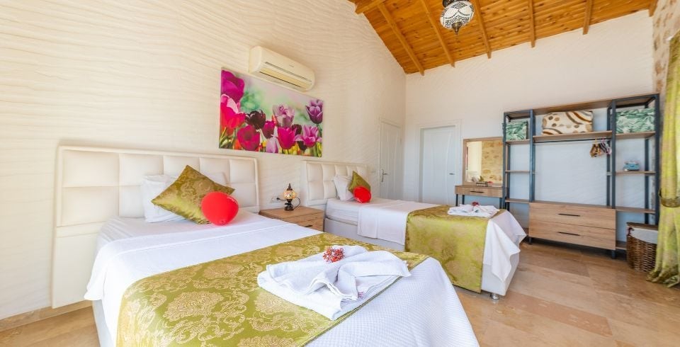 2. Yatak Odası : 2 adet tek kişilik yatak, klima, komodin, makyaj masası, berjer, elbise dolabı, banyo ve tuvalet bulunmaktadır. Havuz terasına çıkış yapılabilmektedir.
