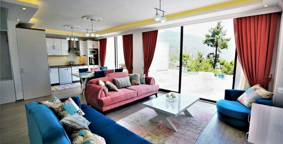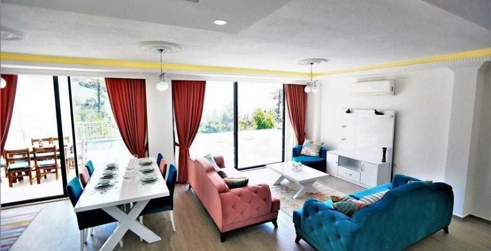 Salon : Villa Sultan’ın salonunda sizi şık bir oturma grubu ile klima, televizyon, internet, uydu, koltuk, sehpa ile ferah bir salon bekliyor olacaktır. Havuz terasına çıkış yapılmaktadır.
