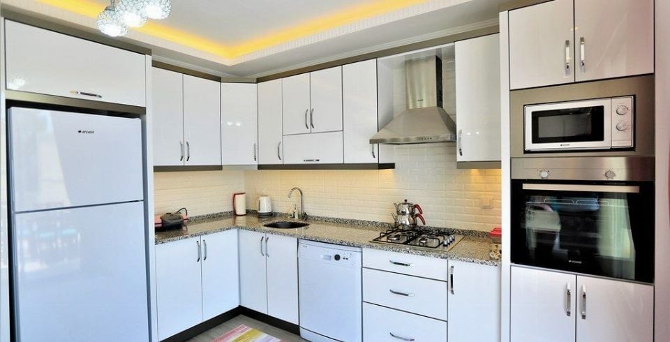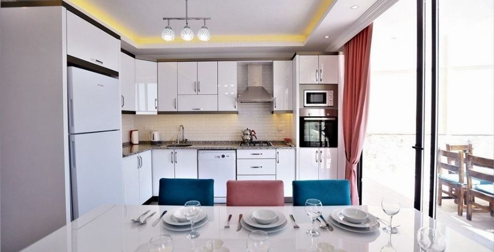 Mutfak : Villamızın geniş Amerikan mutfağı ile sizlere kendi evinizin mutfağı gibi hissettirecek. Ayrıca mutfakta klima, bulaşık makinası, buzdolabı, çamaşır makinası, mikrodalga fırın, tost makinası, ekmek kızartma, su ısıtıcısı, fırın, 4`lü ocak seti ve 6 kişilik geniş yemek masası ile tava tencere vb. mutfak araç gereçlerini kullanma fırsatını sizlere sunuyoruz.