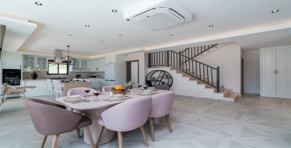 Mutfak : Amerikan açık mutfak ve salona sahip villamızın mutfağında buzdolabı, bulaşık makinası, ankastre ocak, fırın, mikrodalga, 4'lü ankastre ocak, kettle, çamaşır makinası, yemek masası ve tüm mutfak araç ve gereçleri bulunmaktadır.