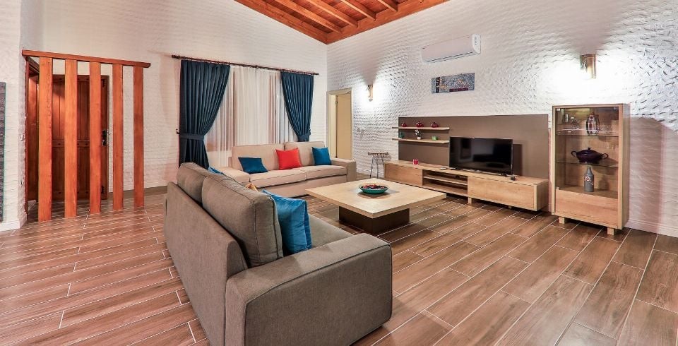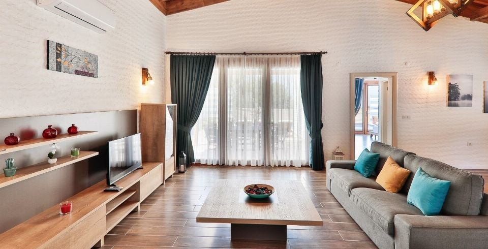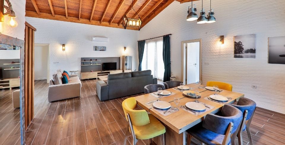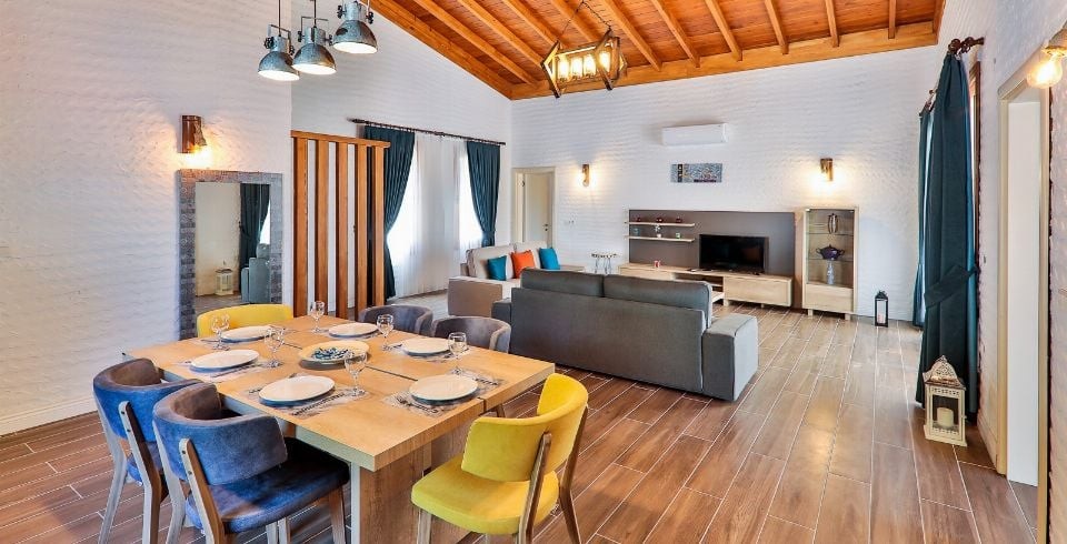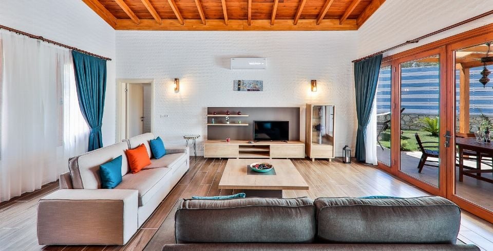 Salon : Salon içerisinde oturma grubu, TV, klima, sehpa bulunmaktadır. Havuz terasına çıkış yapılabilmektedir.
