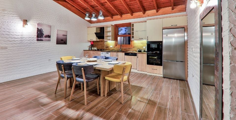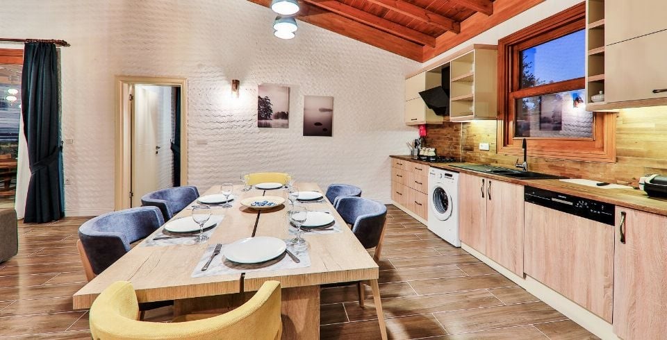 Mutfak : Modern Amerikan mutfak içerisinde buzdolabı, bulaşık makinası, fırın, ocak, mikrodalga fırın, tost makinası, yemek masası, yemek takımları, çatal ve bıçak takımları, tencere ve tava takımları, bardaklar bulunmaktadır.