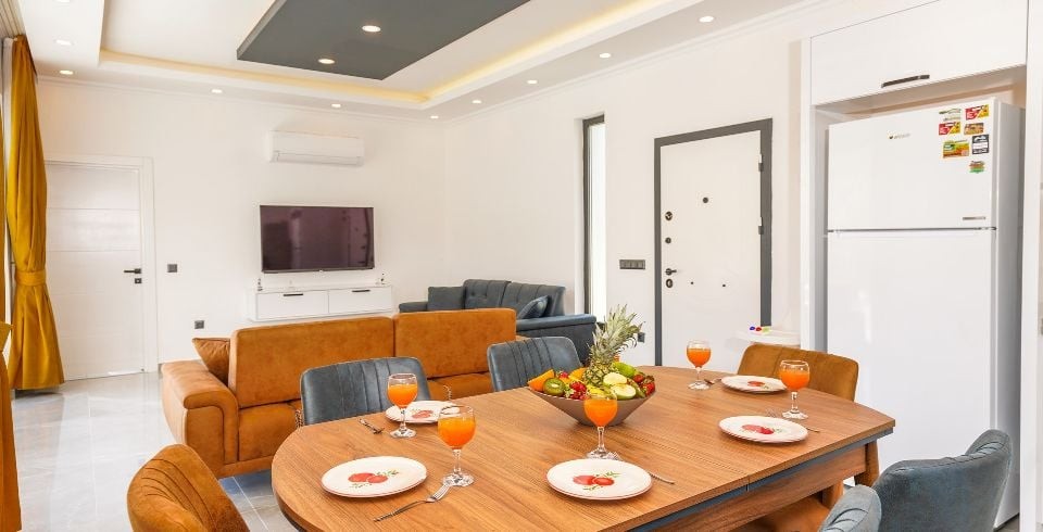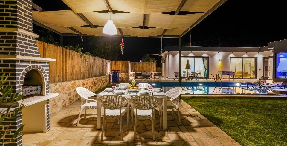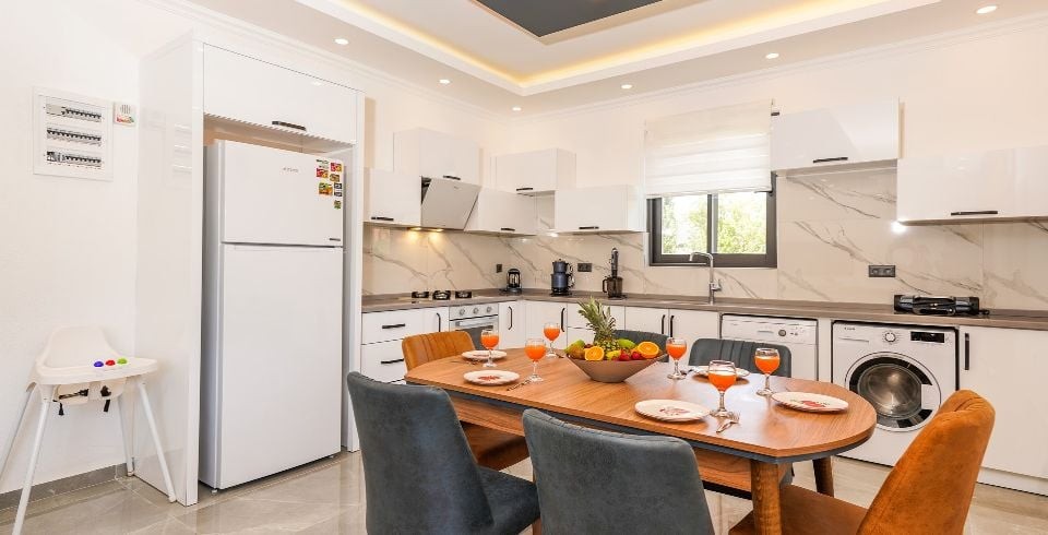 Mutfak : Villamızın içinde modern Amerikan mutfak bulunmaktadır. Mutfakta mikrodalga fırın, bulaşık makinası, ankastre fırın, buzdolabı, çamaşır makinası, ankastre 4’lü ocak, elektrikli su ısıtıcı kettle, ekmek kızartma makinası, tencere ve tava takımı, yemek takımı, kaşık ve çatal seti ve bardaklar bulunmaktadır. Havuz başına geçiş bulunmaktadır.