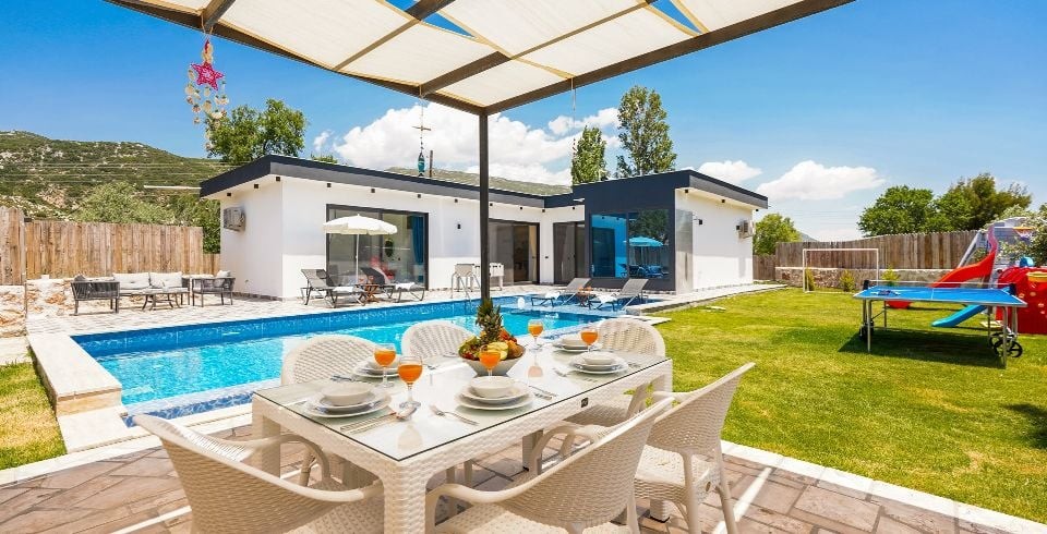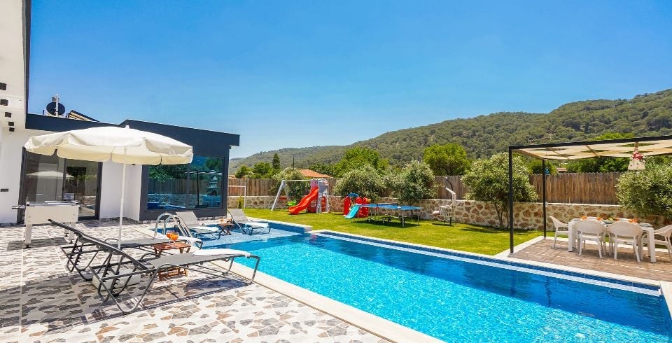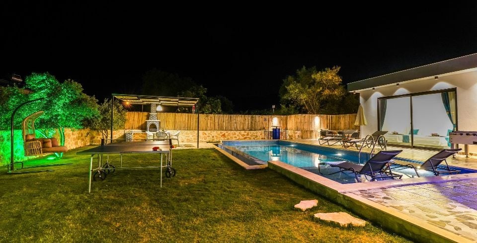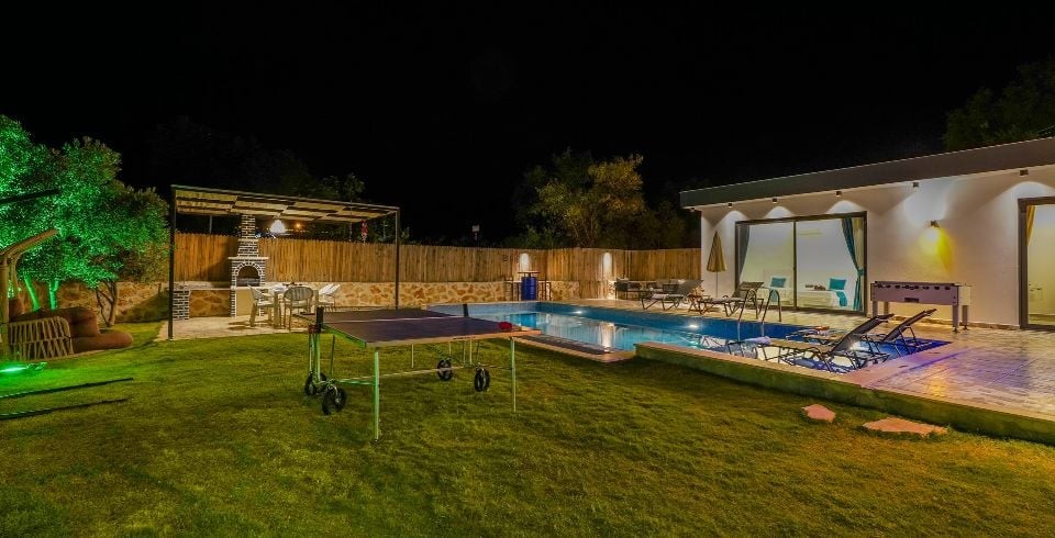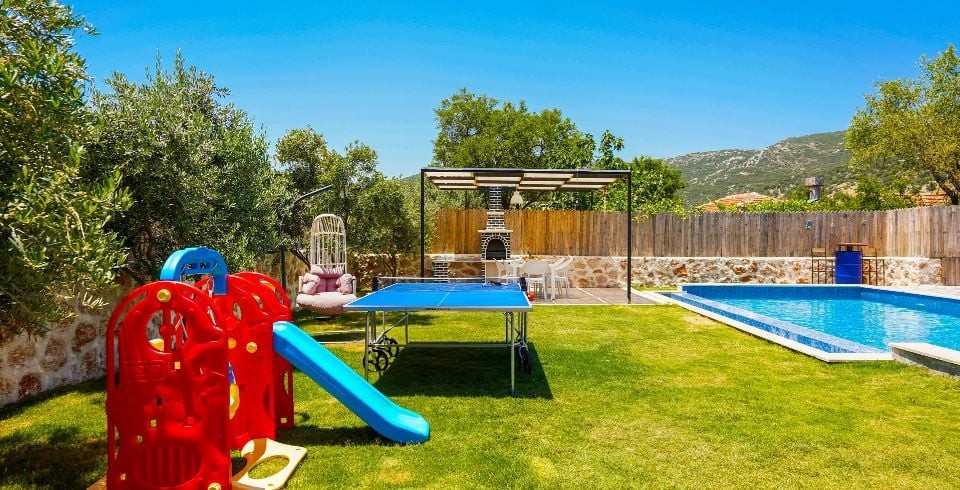 Havuz ve Bahçe : Bahçede havuz, yemek masası, perguleli oturma gurubu salıncak, masa tenisi , oyun parkı ve sandalyeler, barbekü, şezlong ve güneş şemsiyesi bulunmaktadır. Havuz bakımı günlük düzenli olarak görevli tarafından yapılmaktadır.