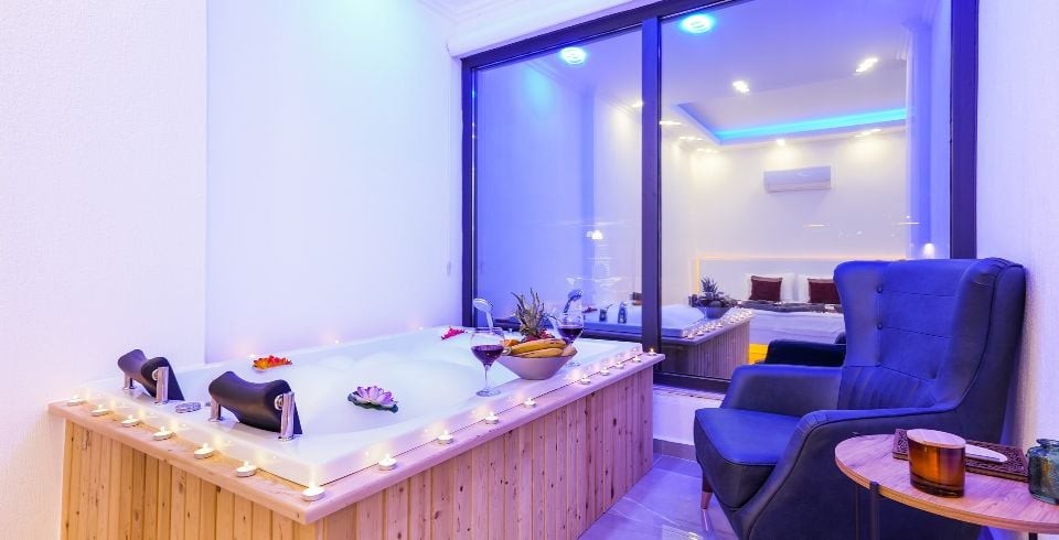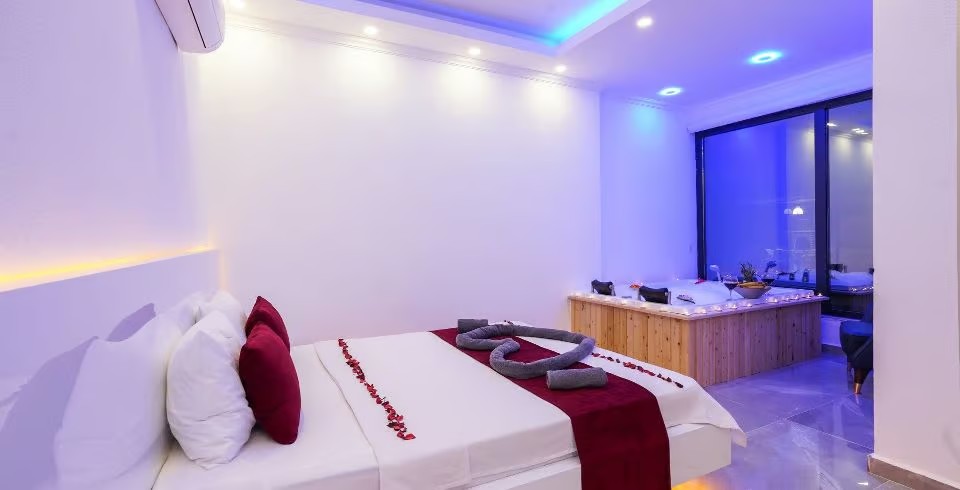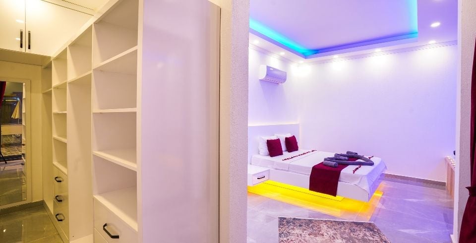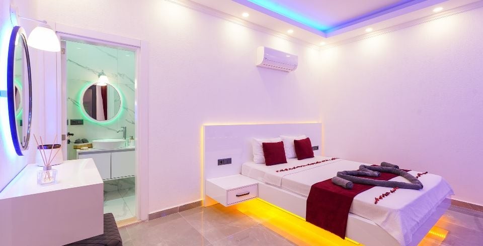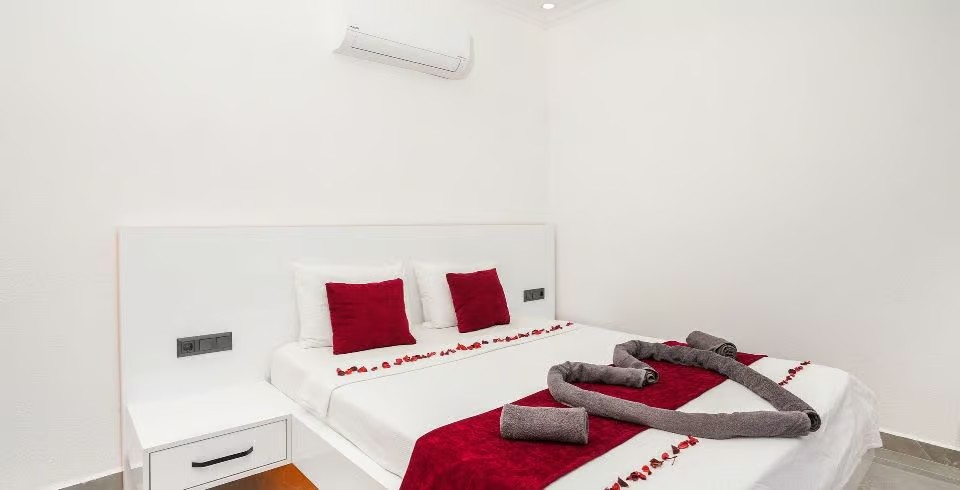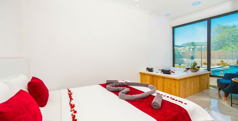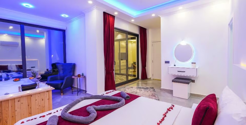 1. Yatak Odası : Süit yatak odası çift kişilik konfor yatak, jakuzi, tv, klima, gardırop, komodin, ve banyo-WC yer almaktadır.