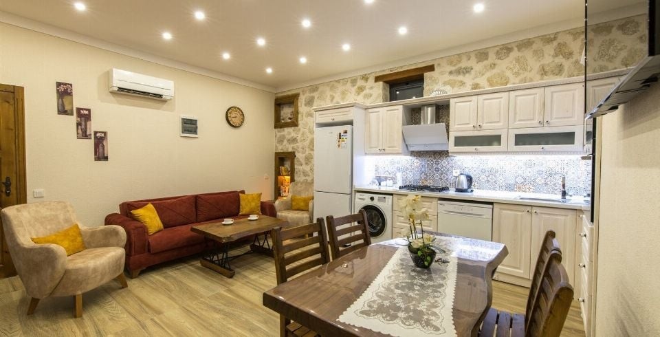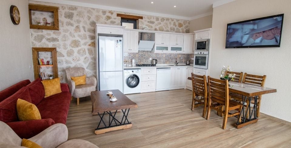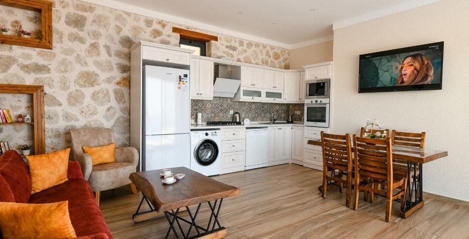 Mutfak: Villamızın Amerikan mutfağında 4 kişilik yemek takımı, klima, tencere tava takımı, buzdolabı, bulaşık makinası, çamaşır makinası, 4'lü ocak, mikrodalga fırın, kettle, çatal bıçak takımı bulunmaktadır.