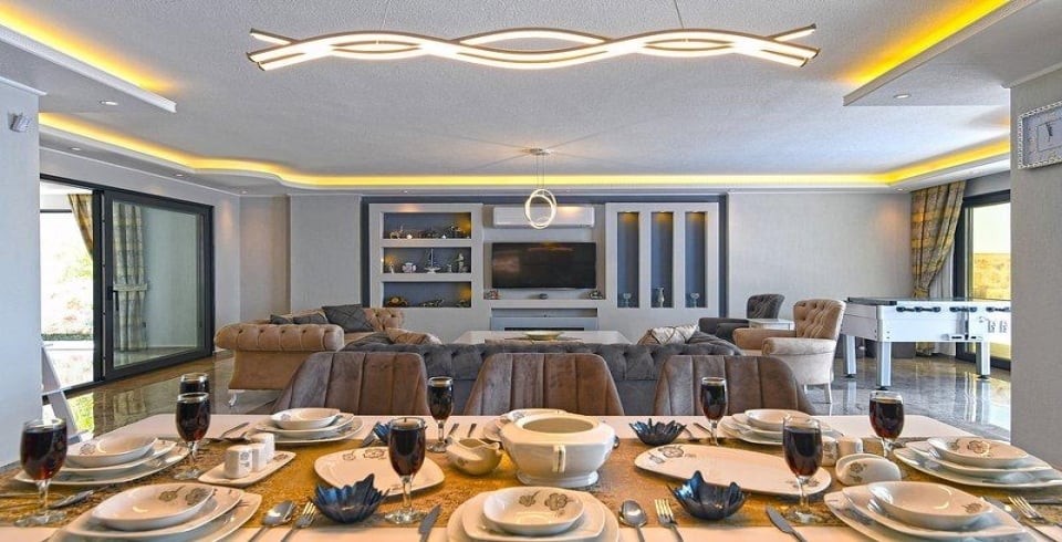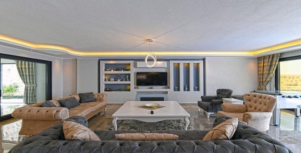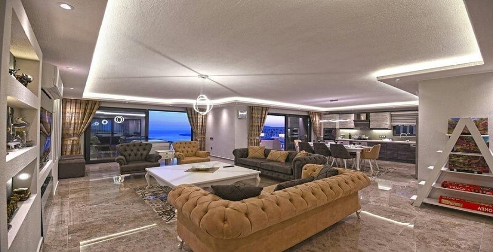 Salon : Villamızın iç dizaynı da son modaya uygun olarak modern bir şekilde tasarlanmıştır. Çeşitli dekoratif eşyalarla süslediğimiz salonumuz havuzlu bahçeye açılıyor. Villa salonunda oturma grubu, TV, internet, klima, sehpa bulunmaktadır.