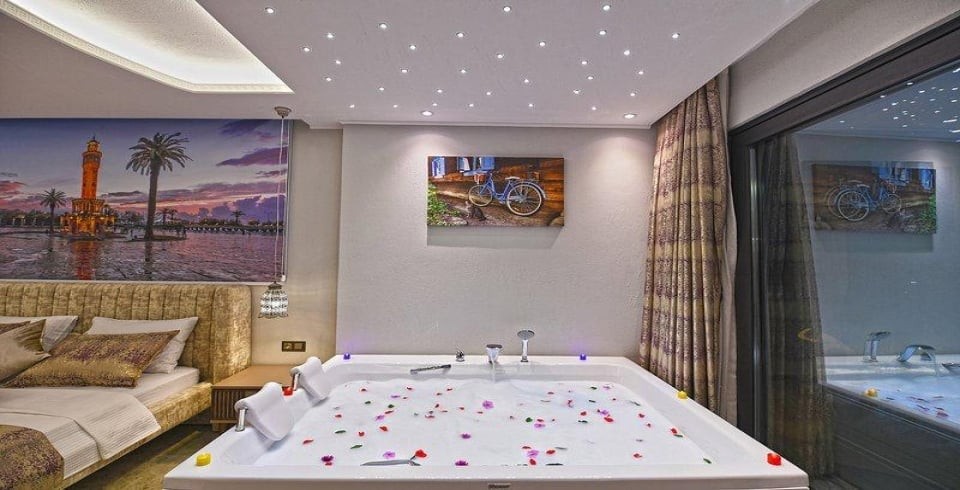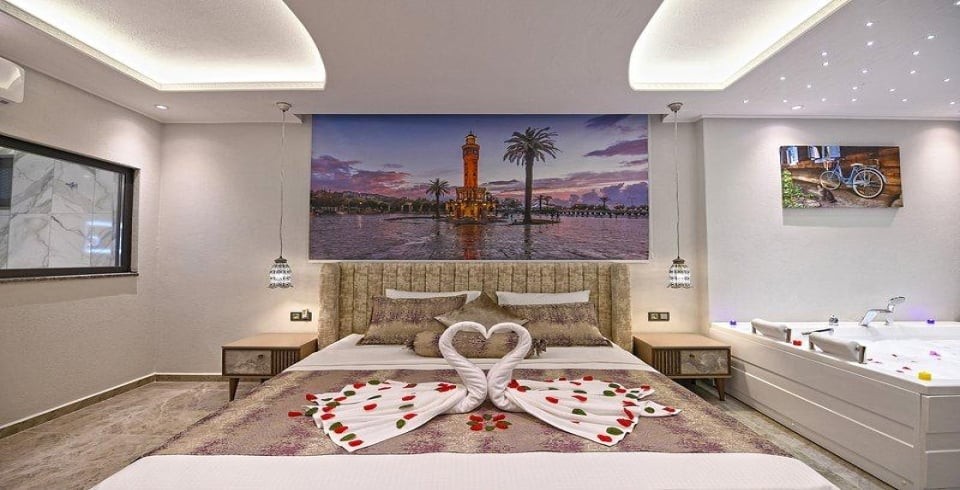 2. Yatak Odası : 1 adet çift kişilik yatak, klima, komodin, makyaj masası, elbise dolabı, TV, jakuzi, banyo ve lavabo bulunmaktadır.