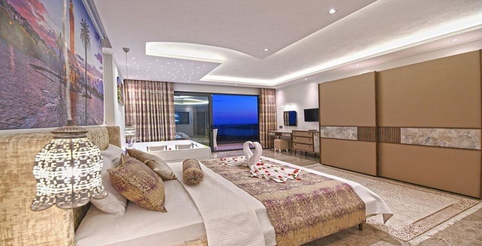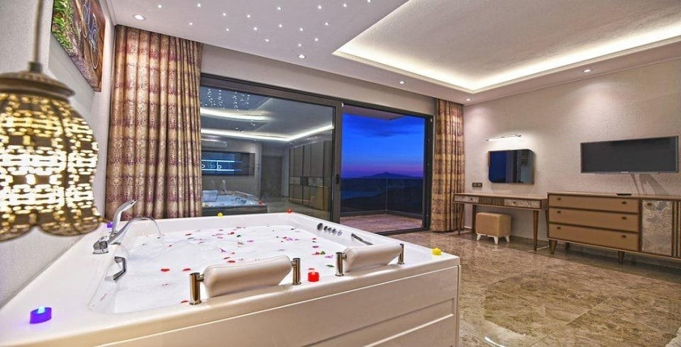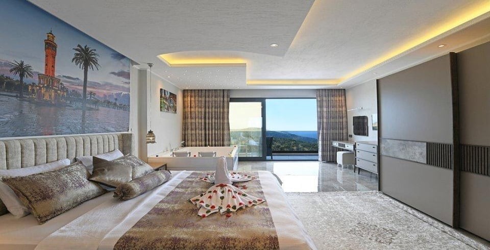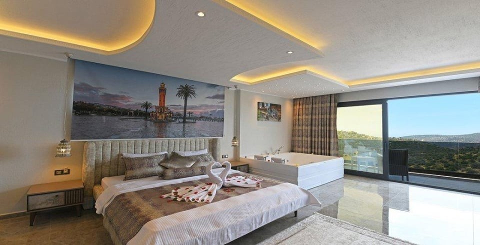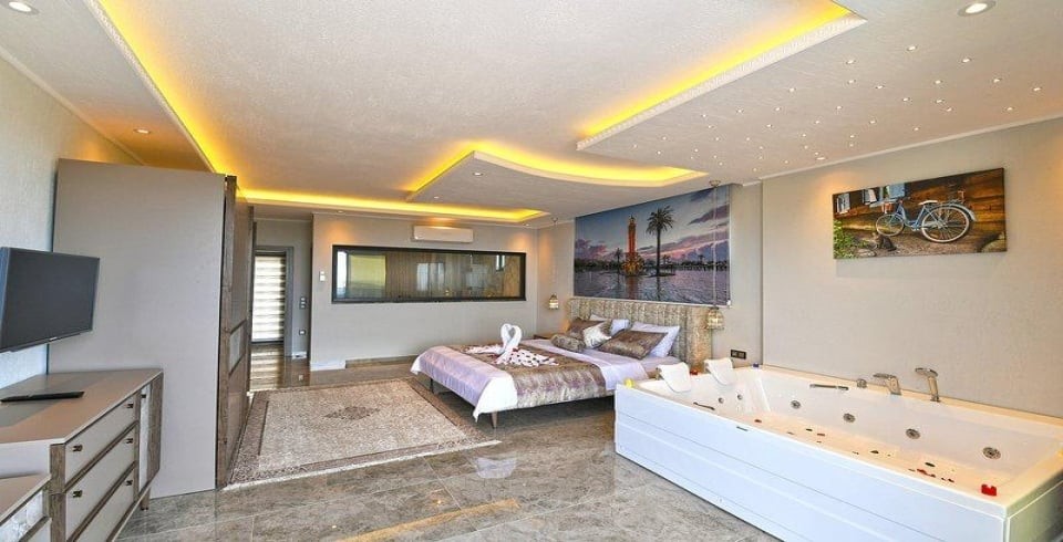 1. Yatak Odası : 1 adet çift kişilik yatak, klima, komodin, makyaj masası, elbise dolabı, TV, iç havuz, banyo ve lavabo bulunmaktadır.