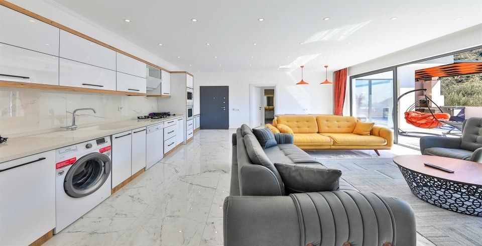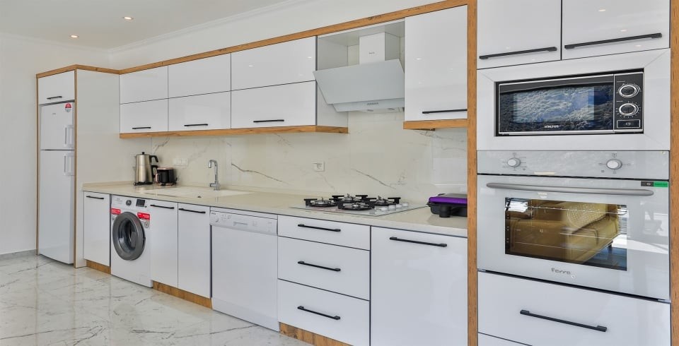 Mutfak : Modern Amerikan mutfak içerisinde buzdolabı, bulaşık makinası, fırın, ocak, mikrodalga fırın, tost makinası, yemek masası, yemek takımları, çatal ve bıçak takımları, tencere ve tava takımları, bardaklar bulunmaktadır.