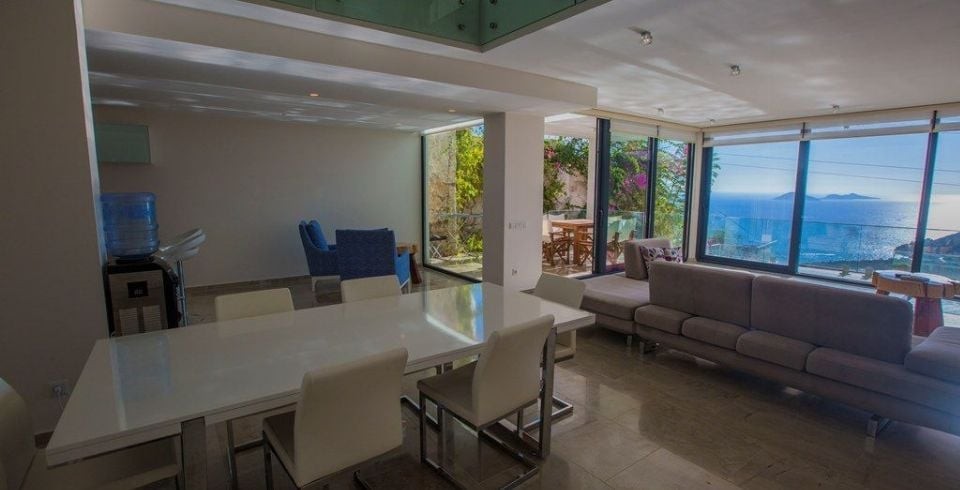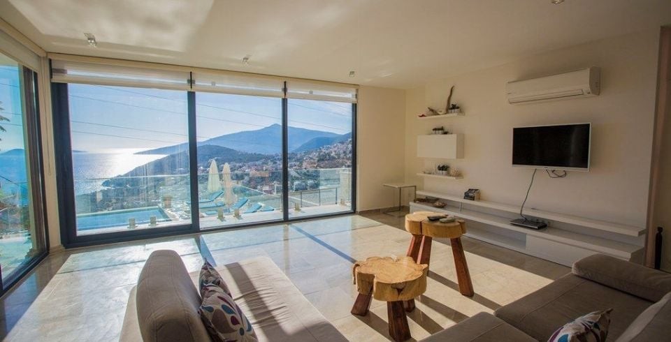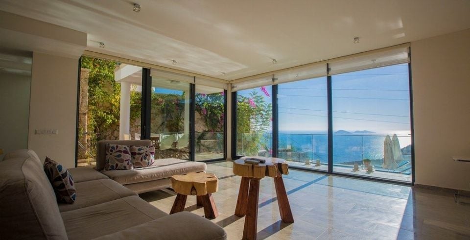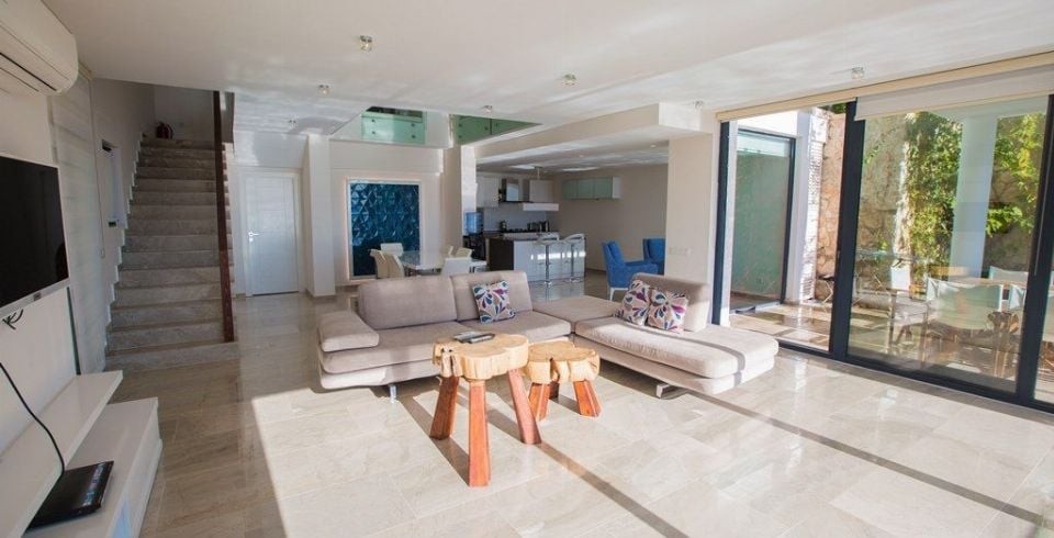Salon : Villamızın salonu deniz manzaralı olup muhteşem deniz manzarasına sahiptir. Oturma grubu, TV uydu, klima, bulunmaktadır. Ayrıca salondan havuz başına çıkış yapılmaktadır.