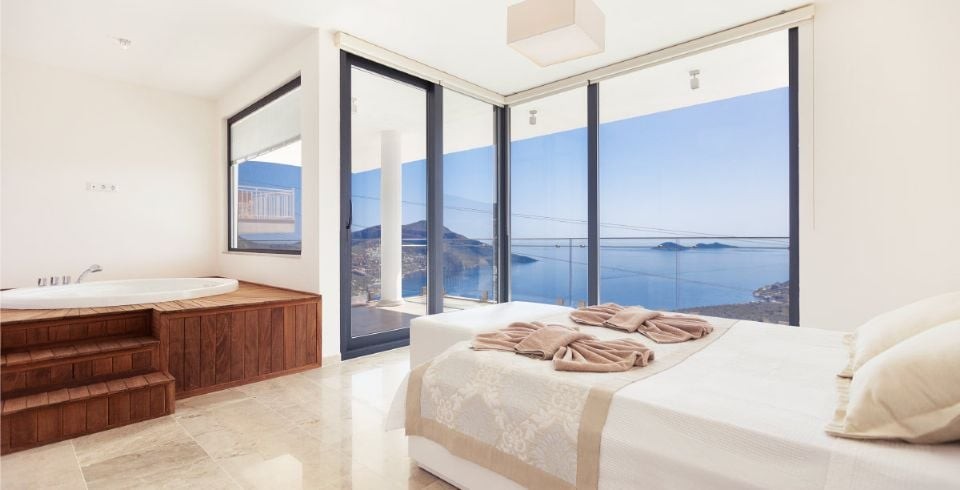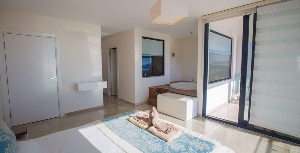 2. Yatak Odası : Çift kişilik süit yatak odası, klima, makyaj masası, elbise dolabı, jakuzi, komodin, banyo ve lavabo bulunmaktadır. Deniz manzaralı balkon