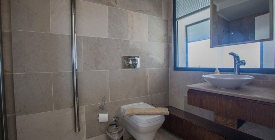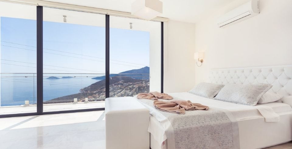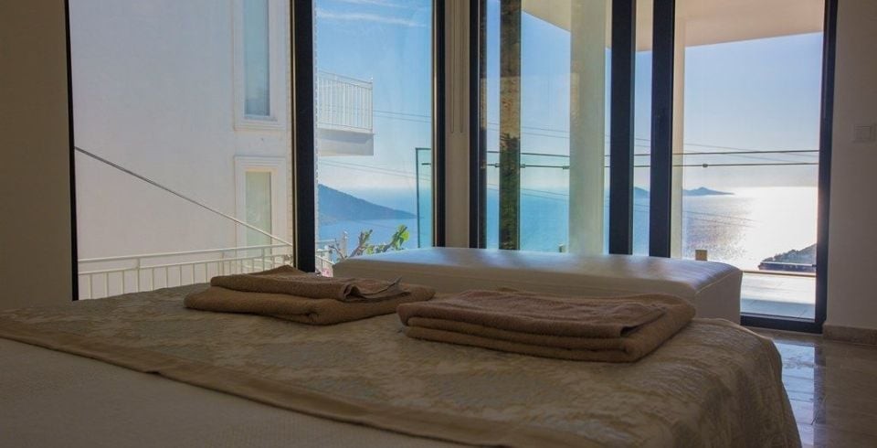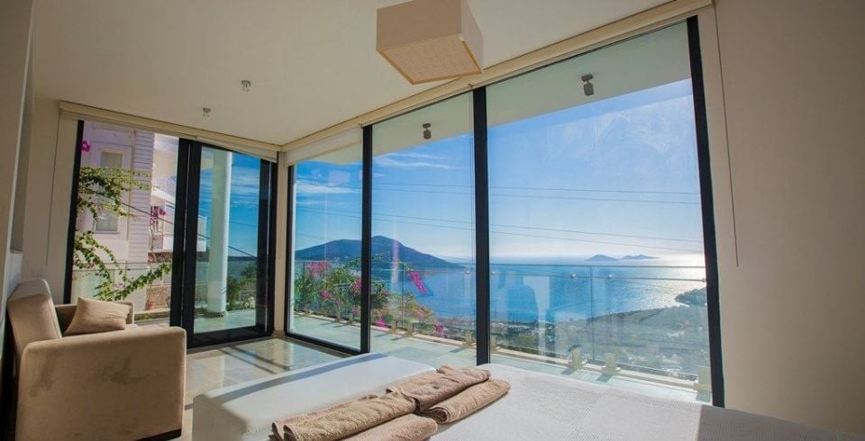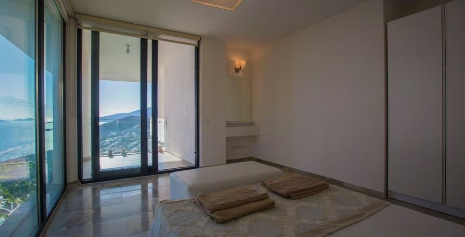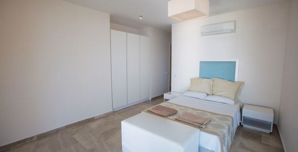 3. Yatak Odası : Çift kişilik süit yatak odası, klima, makyaj masası, elbise dolabı, komodin, banyo ve lavabo bulunmaktadır. Deniz manzaralı balkon.