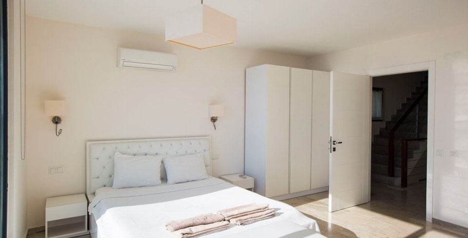 1. Yatak Odası : Çift kişilik süit yatak odası, klima, makyaj masası, elbise dolabı, komodin, banyo ve lavabo bulunmaktadır. Deniz manzaralı balkon.