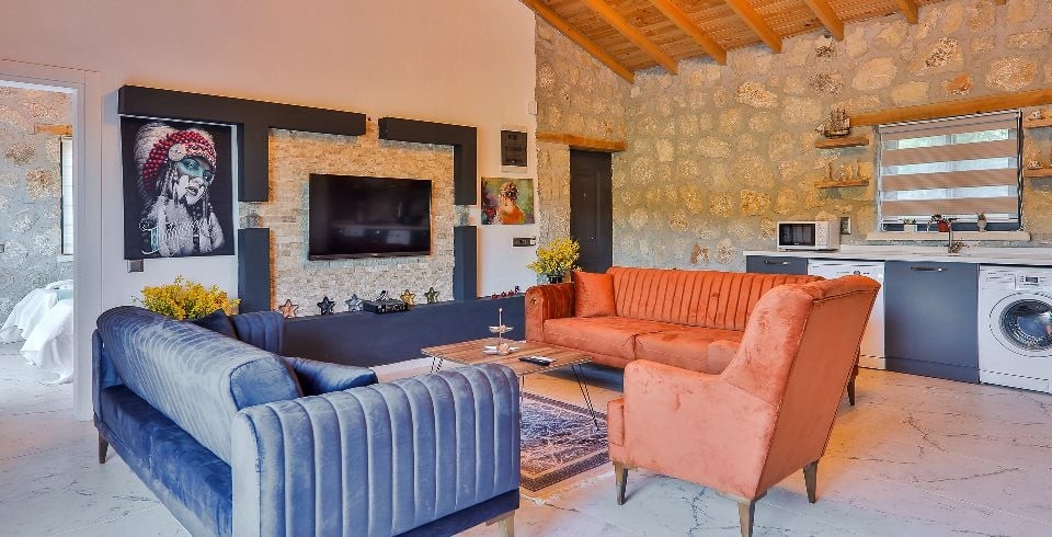 Salon : 2021 yılı içerisinde sitemize dahil olan villamızın iç dizaynı da son modaya uygun olarak modern bir şekilde tasarlanmıştır. Çeşitli dekoratif eşyalarla süslediğimiz salonumuz havuzlu bahçeye açılıyor. Villa Tanç’nın salonunda oturma grubu, TV, internet, klima, yemek masası, sehpa bulunmaktadır.