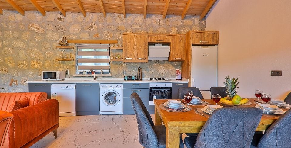 Mutfak : Modern Amerika mutfağımızda 4 kişilik yemek masası, buzdolabı, çamaşır makinesi, mikrodalga fırın, 4’lü ocak, tost makinesi, elektrikli su ısıtıcısı, çatal-bıçak takımı, tencere-tava takımı, bulaşık makinesi bulunmaktadır.