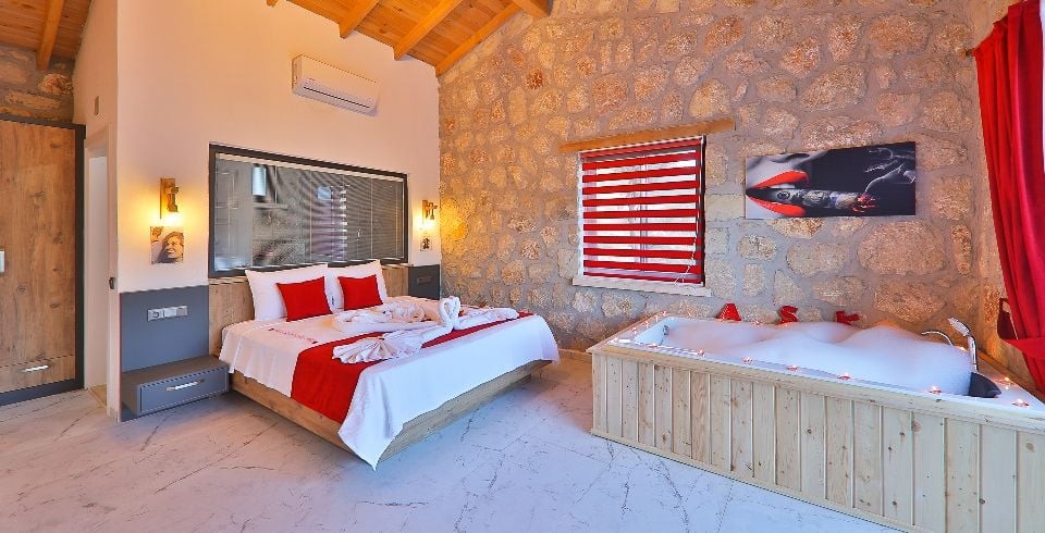 1. Yatak Odası : Doğa ile iç içe olan villamızın yatak odası manzarasında da sizi sonsuz güzel yeşillikler karşılayacak. Eşsiz doğa manzarasına karşı bir de jakuzi bulunmaktadır. Beraberinde çift kişilik yatak, klima, komodin, makyaj masası, banyo ve lavabo bulunmaktadır.