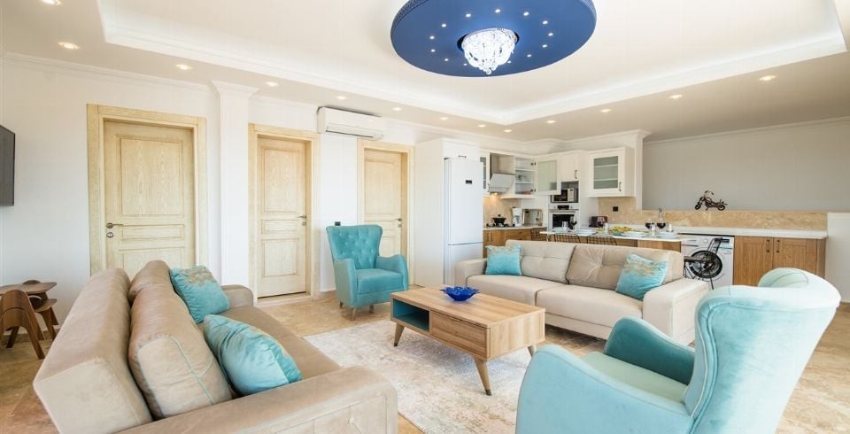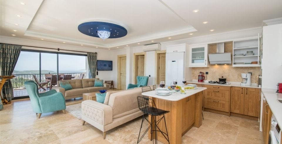 Salon : Deniz ve Doğa manzaralı salon, oturma grubu, 6 kişilik yemek masası, uydu ve TV( LCD), klima, bulunmaktadır