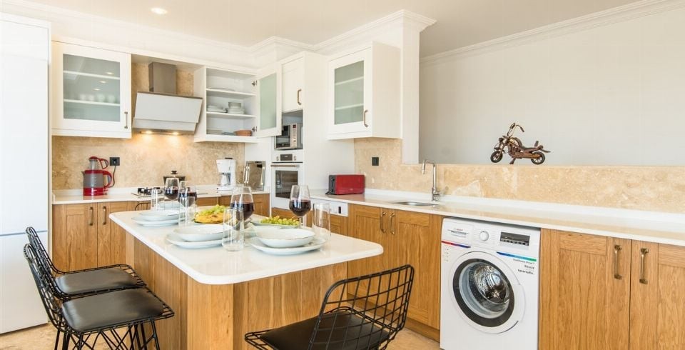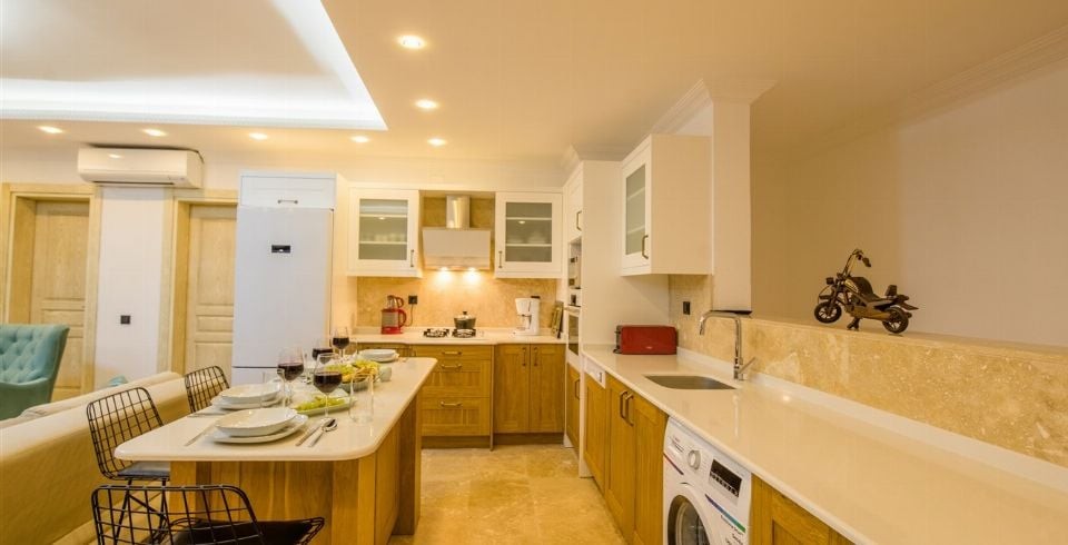 Mutfak : Geniş ferah ve modern dizayn edilmiş Amerikan mutfak buzdolabı, bulaşık makinası, çamaşır makinası, fırın, 4'lü ocak (ankastre), mikrodalga fırın, elektrikli su ısıtıcısı, tava ve tencere vb. mutfak ekipmanları, 6 kişilik yemek takımı bulunmaktadır.