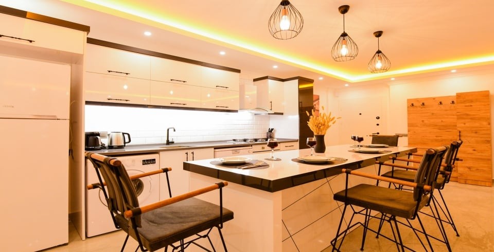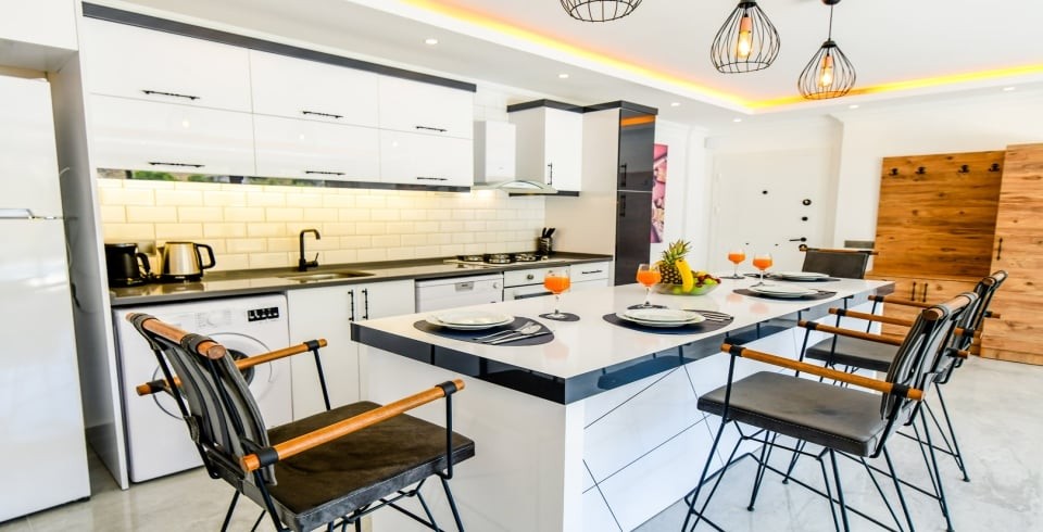 Mutfak : Villamızın mutfağında buzdolabı bulaşık makinası, çamaşır makinası,4 lü ocak, kettle, 4 kişilik yemek takımı bulunmaktadır.