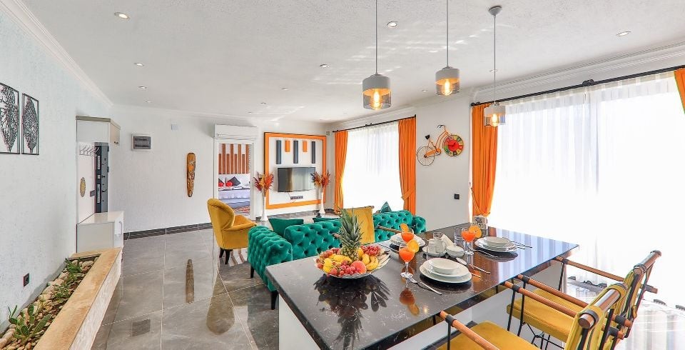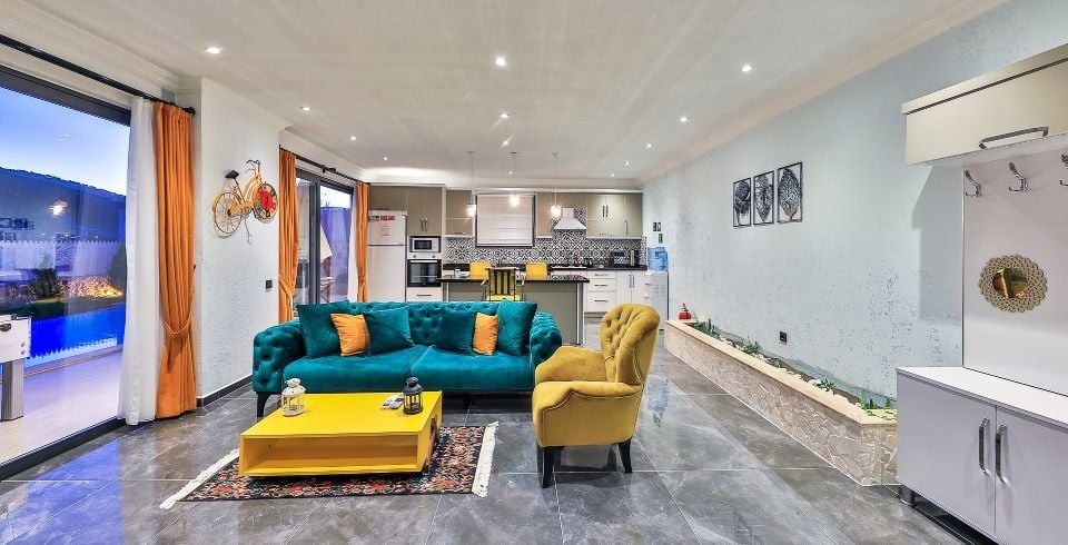 Salon : Villamızın Salonundan havuz manzarası karşısında oturma grubumuz, plazma TV, uydu alıcısı, klima, lavabo, ütü, ütü masası tuvalet bulunmaktadır.
